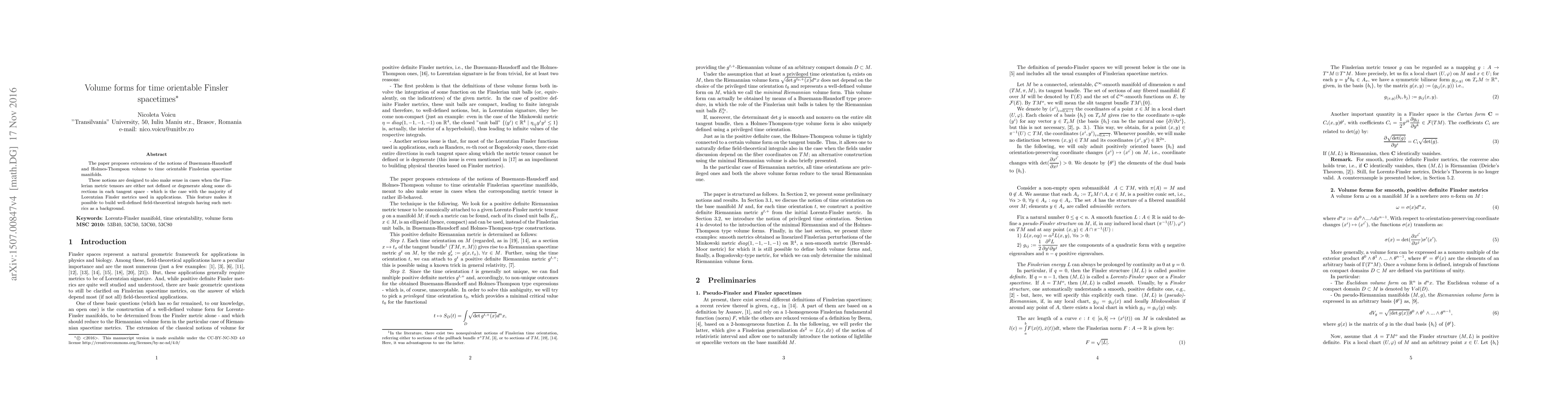 The paper introduces new volume forms for time orientable Finsler spacetimes, replacing problematic integrations on non-compact indicatrices with integrations on ellipsoids. The Busemann-Hausdorff-type volume form can be constructed even with degenerate metrics, enabling well-defined field-theoretical integrals.
