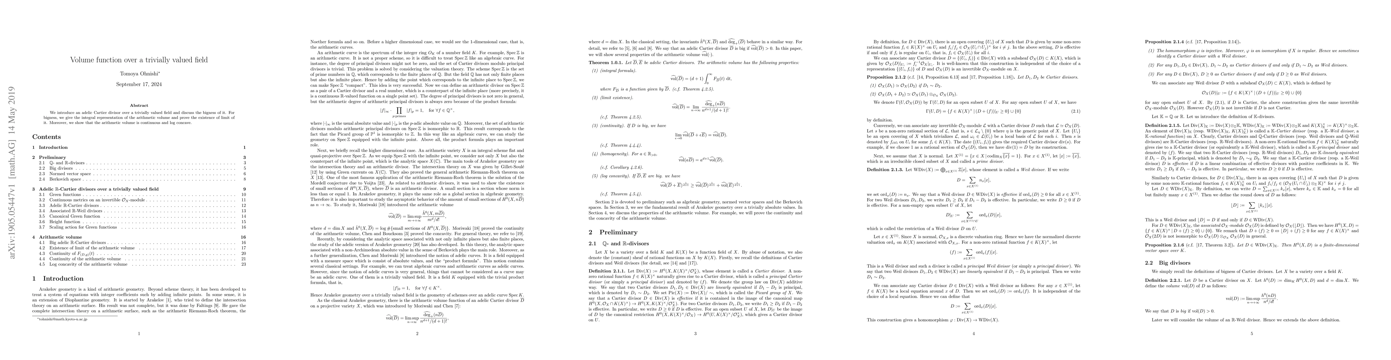 The paper introduces an adelic Cartier divisor over a trivially valued field and demonstrates the bigness of this divisor by providing an integral representation of its arithmetic volume. It proves the existence and continuity of this volume and establishes its log concavity.