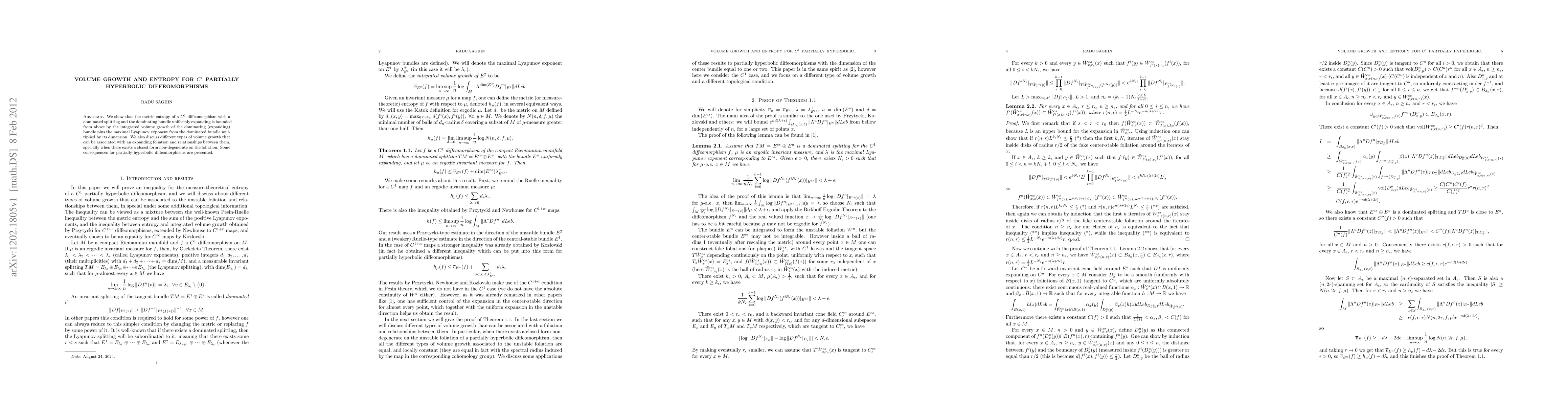 We show that the metric entropy of a $C^1$ diffeomorphism with a dominated splitting and the dominating bundle uniformly expanding is bounded from above by the integrated volume growth of the dominating (expanding) bundle plus the maximal Lyapunov exponent from the dominated bundle multiplied by its dimension. We also discuss different types of volume growth that can be associated with an expanding foliation and relationships between them, specially when there exists a closed form non-degenerate on the foliation. Some consequences for partially hyperbolic diffeomorphisms are presented.