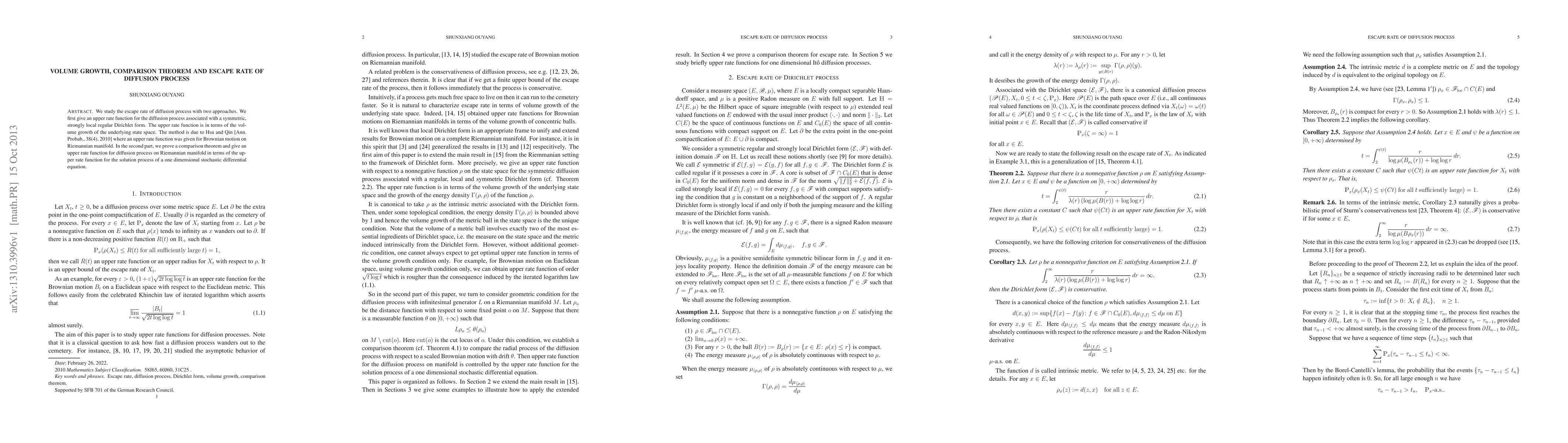 This paper investigates the escape rate of diffusion processes using two methods. It establishes an upper rate function for diffusion processes linked to symmetric, strongly local regular Dirichlet forms, relating it to the volume growth of the underlying state space. Additionally, it proves a comparison theorem and provides an upper rate function for diffusion processes on Riemannian manifolds in terms of a one-dimensional stochastic differential equation's solution process.