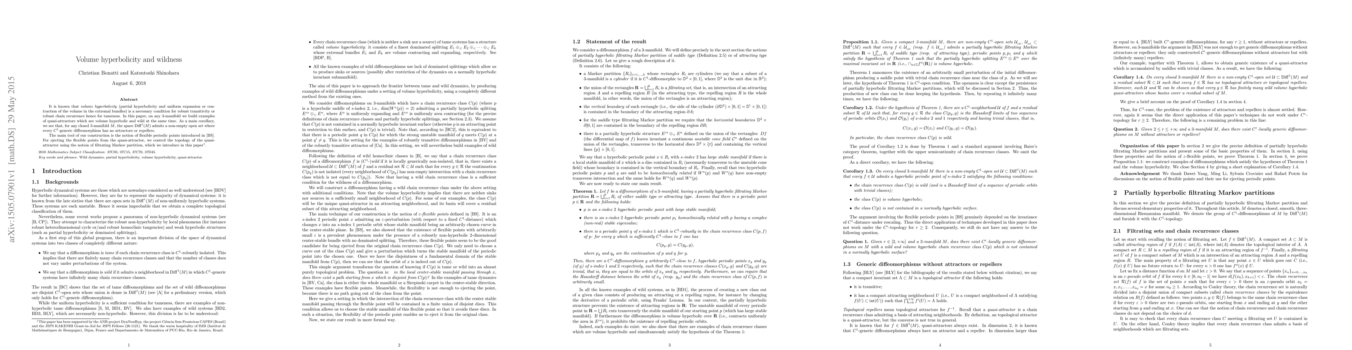 It is known that volume hyperbolicity (partial hyperbolicity and uniform expansion or contraction of the volume in the extremal bundles) is a necessary condition for robust transitivity or robust chain recurrence hence for tameness. In this paper, on any 3-manifold we build examples of quasi-attractors which are volume hyperbolic and wild at the same time. As a main corollary, we see that, for any closed 3-manifold $M$, the space $\mathrm{Diff}^1(M)$ admits a non-empty open set where every $C^1$-generic diffeomorphism has no attractors or repellers. The main tool of our construction is the notion of flexible periodic points introduced by the authors. For ejecting the flexible points from the quasi-attractor, we control the topology of the quasi-attractor using the notion of partially hyperbolic filtrating Markov partition, which we introduce in this paper.