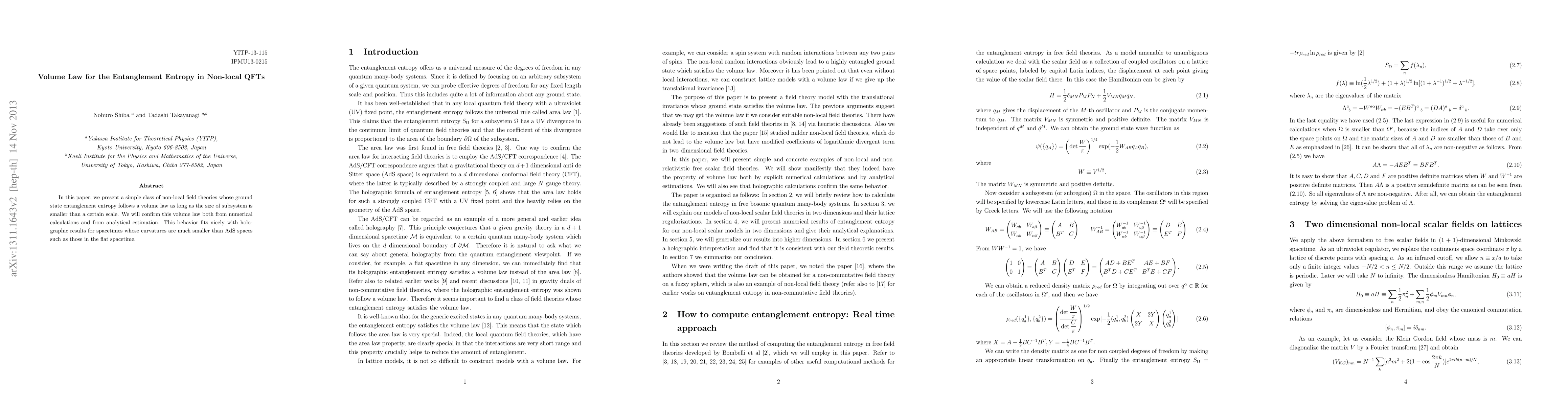 In this paper, we present a simple class of non-local field theories whose ground state entanglement entropy follows a volume law as long as the size of subsystem is smaller than a certain scale. We will confirm this volume law both from numerical calculations and from analytical estimation. This behavior fits nicely with holographic results for spacetimes whose curvatures are much smaller than AdS spaces such as those in the flat spacetime.