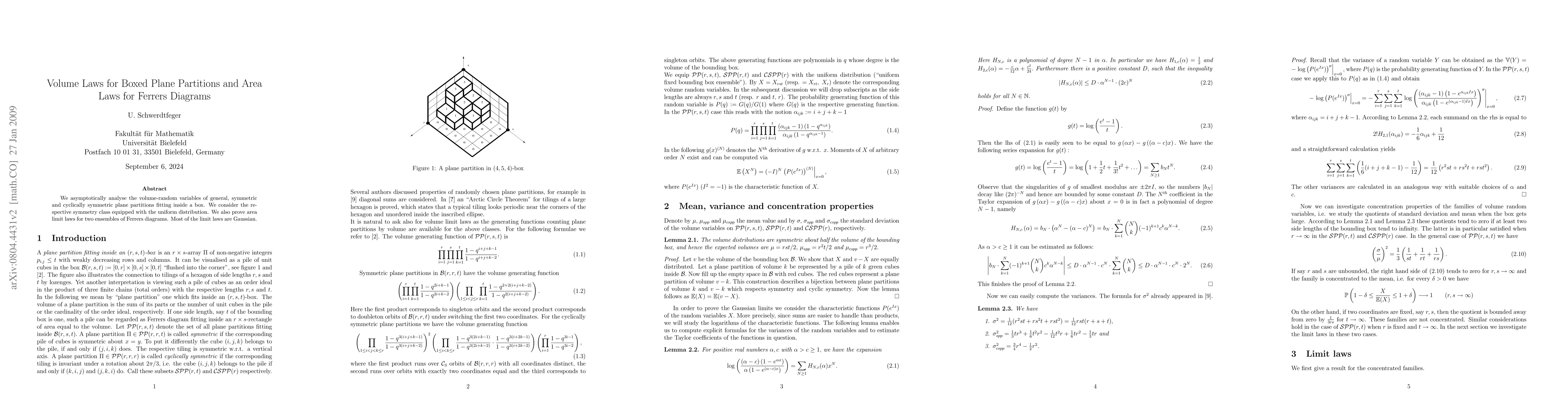 We asymptotically analyse the volume-random variables of general, symmetric and cyclically symmetric plane partitions fitting inside a box. We consider the respective symmetry class equipped with the uniform distribution. We also prove area limit laws for two ensembles of Ferrers diagrams. Most of the limit laws are Gaussian.