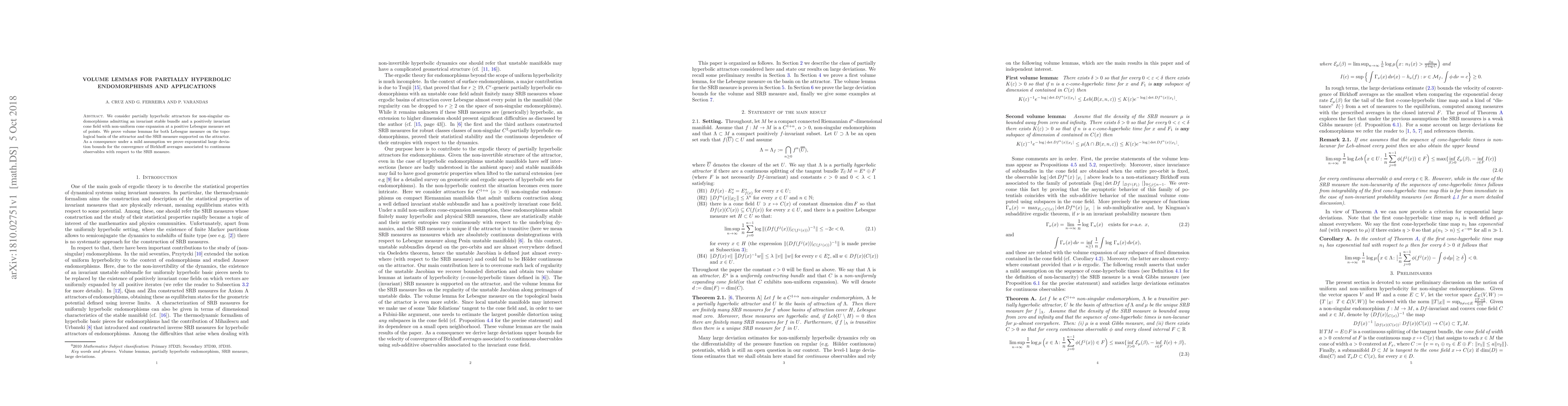 We consider partially hyperbolic attractors for non-singular endomorphisms admitting an invariant stable bundle and a positively invariant cone field with non-uniform cone expansion at a positive Lebesgue measure set of points. We prove volume lemmas for both Lebesgue measure on the topological basin of the attractor and the SRB measure supported on the attractor.As a consequence under a mild assumption we prove exponential large deviation bounds for the convergence of Birkhoff averages associated to continuous observables with respect to the SRB measure.