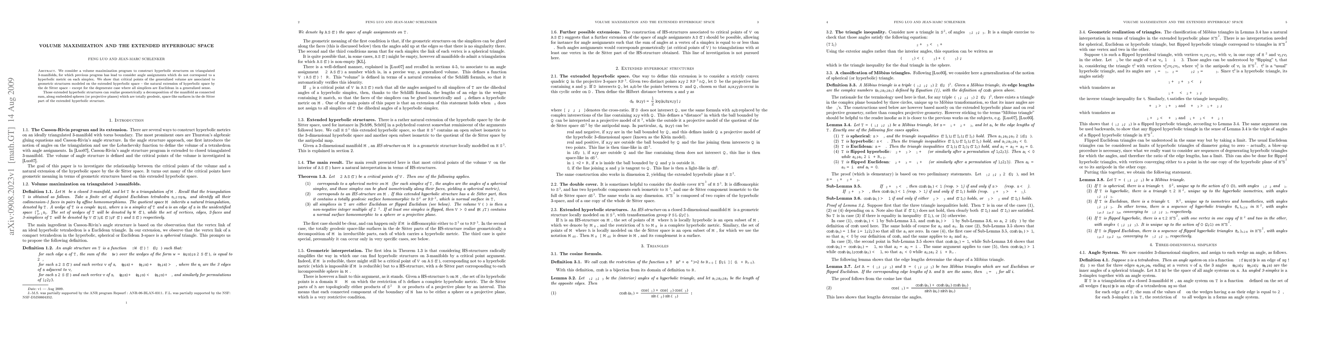 We consider a volume maximization program to construct hyperbolic structures on triangulated 3-manifolds, for which previous progress has lead to consider angle assignments which do not correspond to a hyperbolic metric on each simplex. We show that critical points of the generalized volume are associated to geometric structures modeled on the extended hyperbolic space -- the natural extension of hyperbolic space by the de Sitter space -- except for the degenerate case where all simplices are Euclidean in a generalized sense. Those extended hyperbolic structures can realize geometrically a decomposition of the manifold as connected sum, along embedded spheres (or projective planes) which are totally geodesic, space-like surfaces in the de Sitter part of the extended hyperbolic structure.