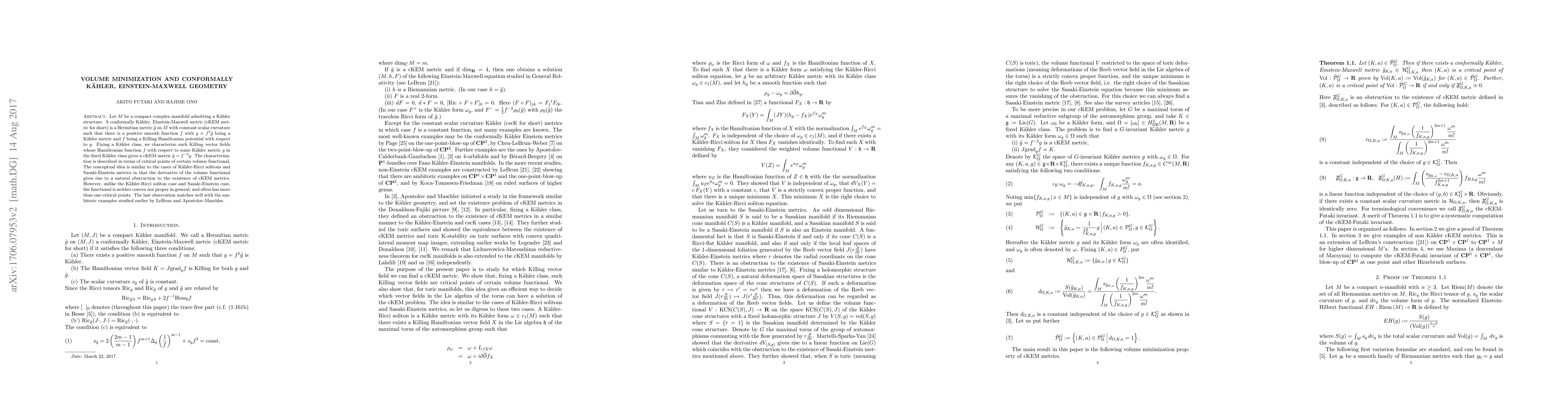 This paper investigates compact complex manifolds equipped with a Kähler structure, focusing on identifying Hermitian metrics that form conformally Kähler, Einstein-Maxwell metrics. It characterizes Killing vector fields that generate these metrics through critical points of a volume functional, noting that the functional's non-convexity and multiple critical points complicate the existence conditions, contrasting with other soliton structures.