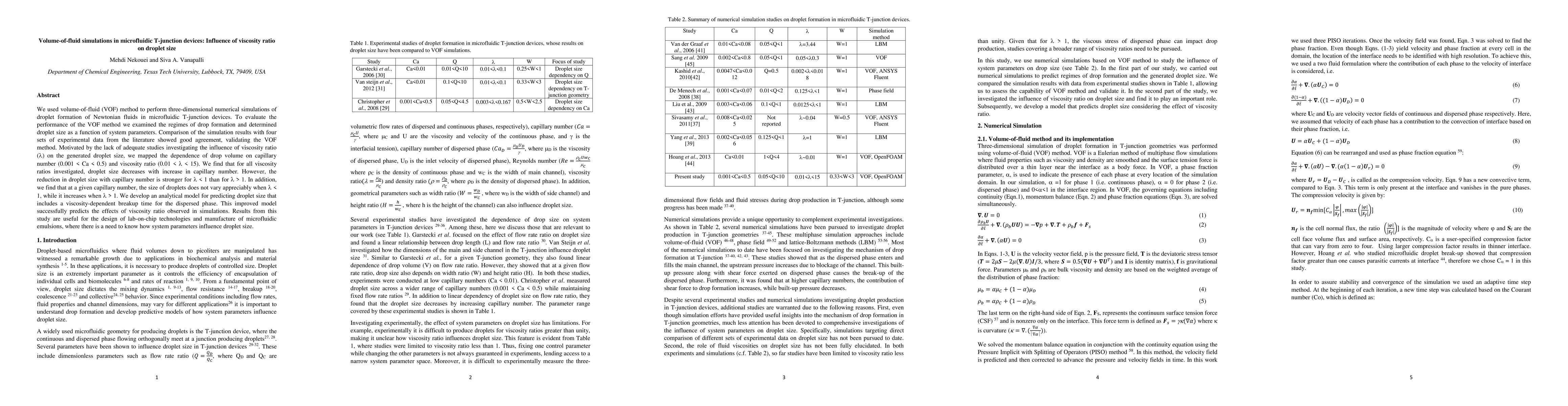 This paper uses the volume-of-fluid method to simulate droplet formation in microfluidic T-junctions, showing that droplet size decreases with higher capillary number and is more sensitive to viscosity ratio when the continuous phase is less viscous. An analytical model developed to predict droplet size based on viscosity-dependent breakup time aligns well with simulation results.