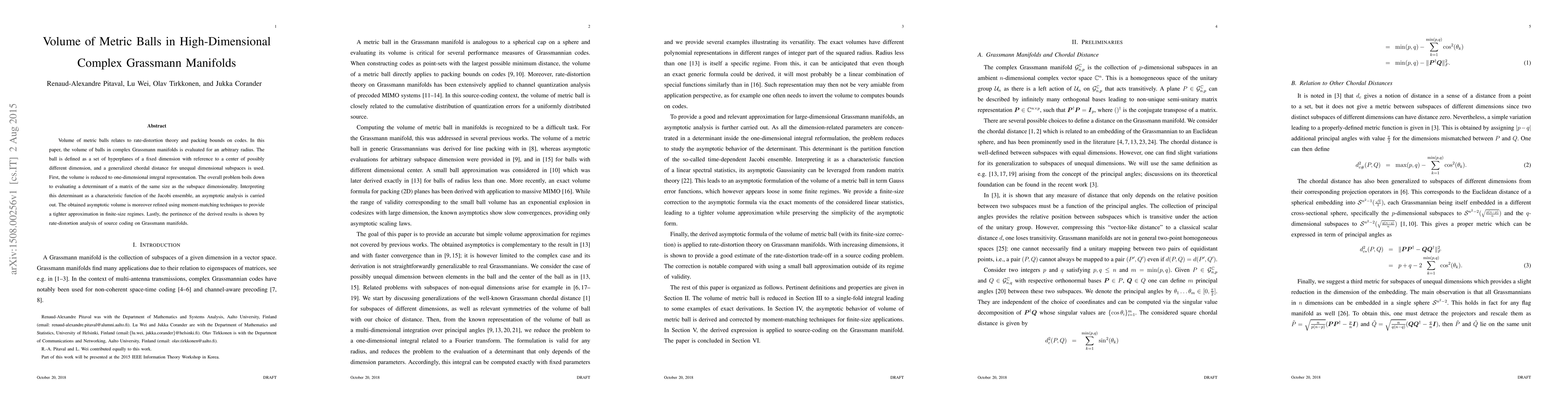 This paper evaluates the volume of metric balls in high-dimensional complex Grassmann manifolds using a generalized chordal distance. It employs an asymptotic analysis to determine the volume, refining the results with moment-matching techniques for finite sizes, and demonstrates the relevance through rate-distortion analysis of source coding.