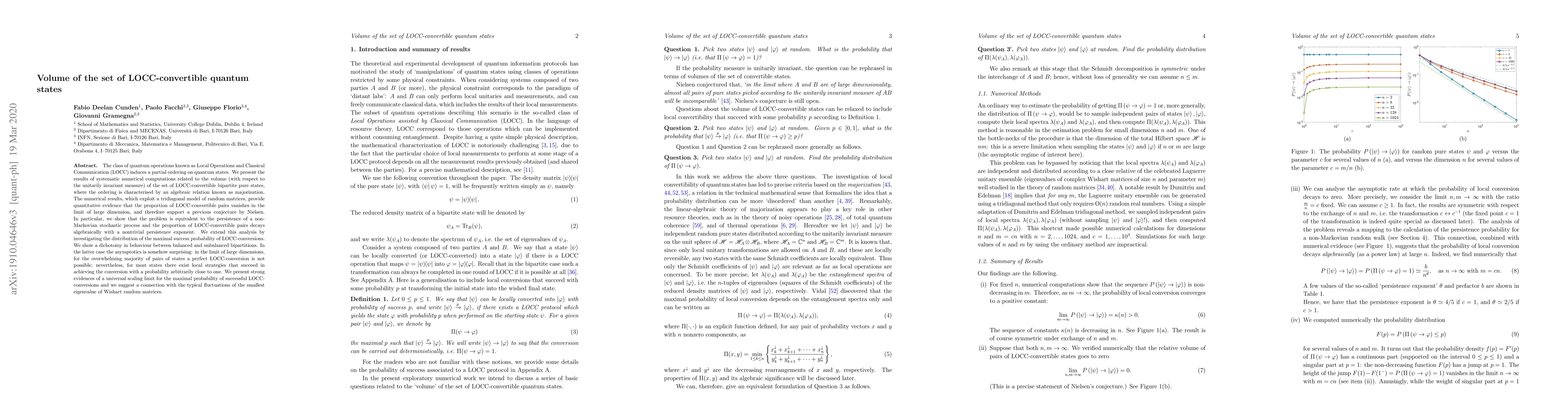 The class of quantum operations known as Local Operations and Classical Communication (LOCC) induces a partial ordering on quantum states. We present the results of systematic numerical computations related to the volume (with respect to the unitarily invariant measure) of the set of LOCC-convertible bipartite pure states, where the ordering is characterised by an algebraic relation known as majorization. The numerical results, which exploit a tridiagonal model of random matrices, provide quantitative evidence that the proportion of LOCC-convertible pairs vanishes in the limit of large dimension, and therefore support a previous conjecture by Nielsen. In particular, we show that the problem is equivalent to the persistence of a non-Markovian stochastic process and the proportion of LOCC-convertible pairs decays algebraically with a nontrivial persistence exponent. We extend this analysis by investigating the distribution of the maximal success probability of LOCC-conversions. We show a dichotomy in behaviour between balanced and unbalanced bipartitions. In the latter case the asymptotics is somehow surprising: in the limit of large dimensions, for the overwhelming majority of pairs of states a perfect LOCC-conversion is not possible; nevertheless, for most states there exist local strategies that succeed in achieving the conversion with a probability arbitrarily close to one. We present strong evidences of a universal scaling limit for the maximal probability of successful LOCC-conversions and we suggest a connection with the typical fluctuations of the smallest eigenvalue of Wishart random matrices.