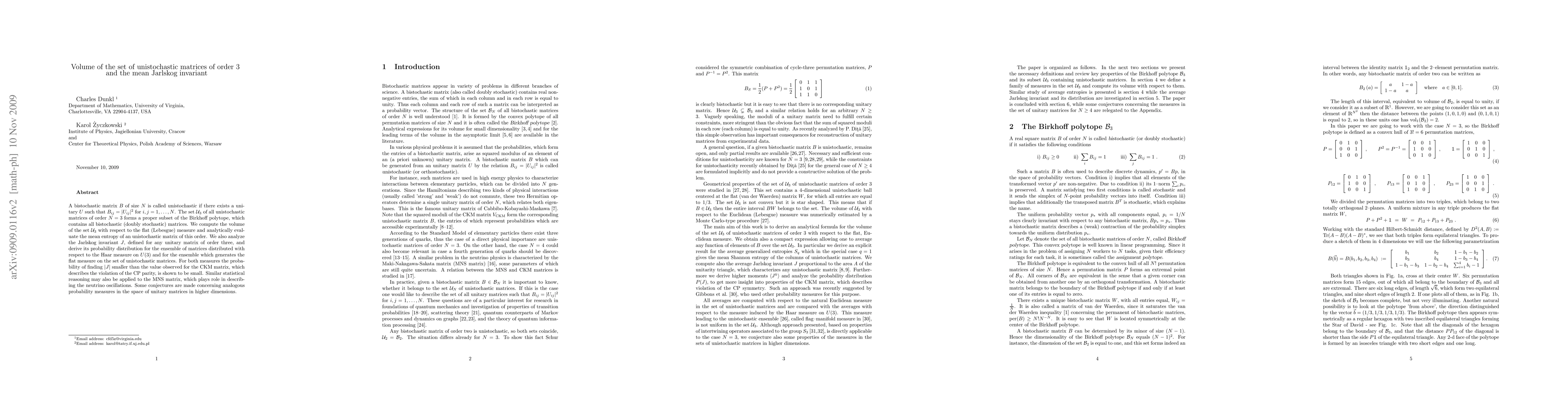 This paper computes the volume of the set of unistochastic matrices of order 3 and evaluates the mean entropy of such matrices. It also analyzes the Jarlskog invariant's distribution, showing that the probability of observing values similar to those in the CKM matrix is small.