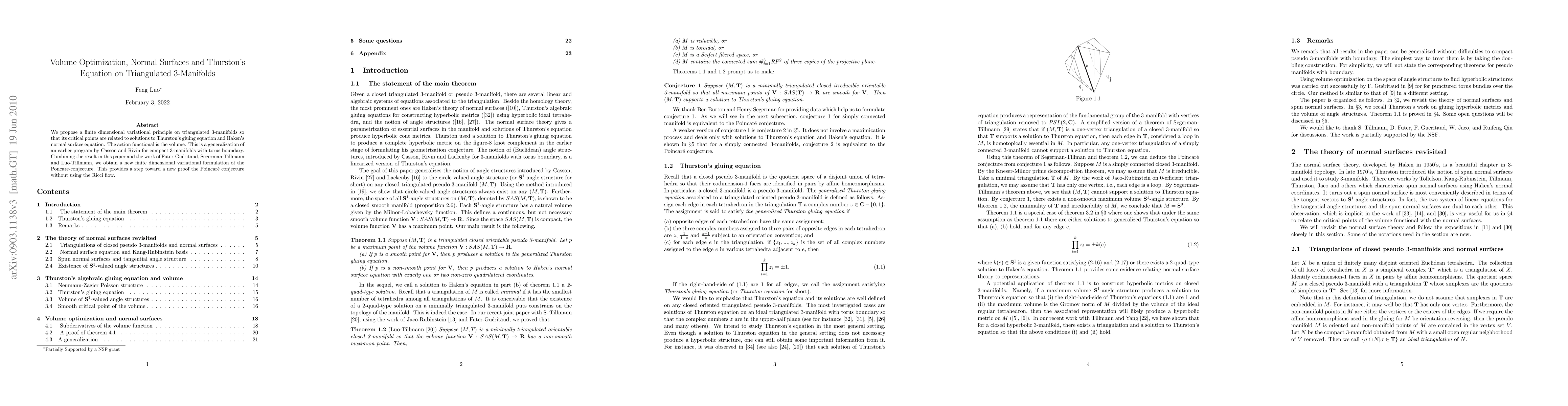We propose a finite dimensional variational principle on triangulated 3-manifolds so that its critical points are related to solutions to Thurston's gluing equation and Haken's normal surface equation. The action functional is the volume. This is a generalization of an earlier program by Casson and Rivin for compact 3-manifolds with torus boundary. Combining the result in this paper and the work of Futer-Gu\'eritaud, Segerman-Tillmann and Luo-Tillmann, we obtain a new finite dimensional variational formulation of the Poncare-conjecture. This provides a step toward a new proof the Poincar\'e conjecture without using the Ricci flow.