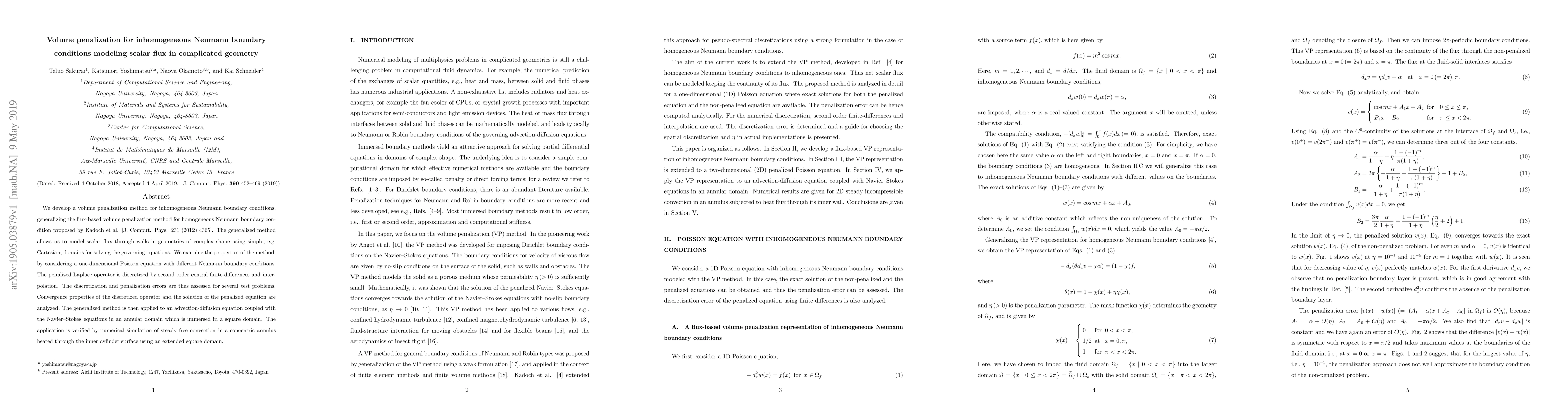 This paper develops a volume penalization method for inhomogeneous Neumann boundary conditions to model scalar flux in complex geometries, generalizing a previous method for homogeneous conditions. The method is applied to solve an advection-diffusion equation coupled with Navier-Stokes equations in an annular domain, verified by simulating steady free convection.
