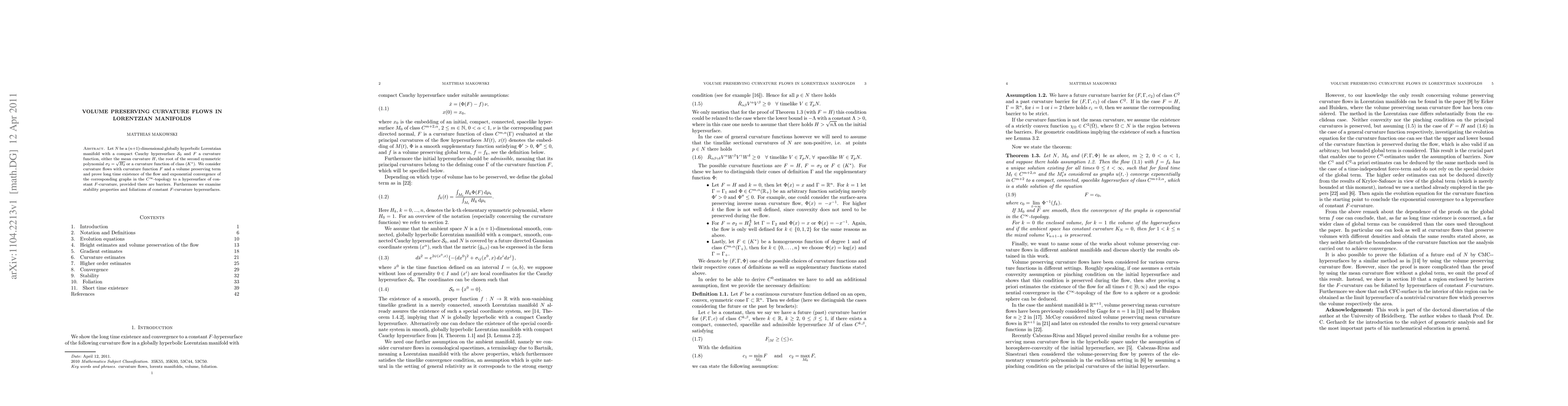 This paper investigates volume-preserving curvature flows in (n+1)-dimensional Lorentzian manifolds, proving long-time existence and exponential convergence to constant curvature hypersurfaces under suitable conditions. It also explores stability and foliations of these constant curvature hypersurfaces.