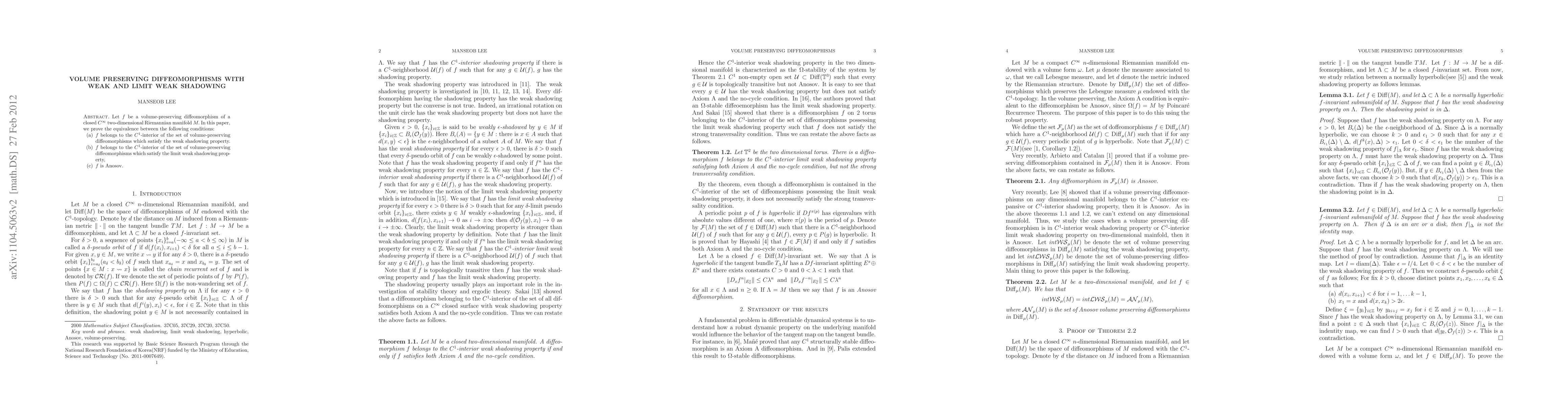 This paper establishes the equivalence between three conditions for volume-preserving diffeomorphisms on closed Riemannian manifolds: weak shadowing, limit weak shadowing, and Anosov dynamics. It shows that these properties are mutually inclusive within the C1-interior of volume-preserving diffeomorphisms.