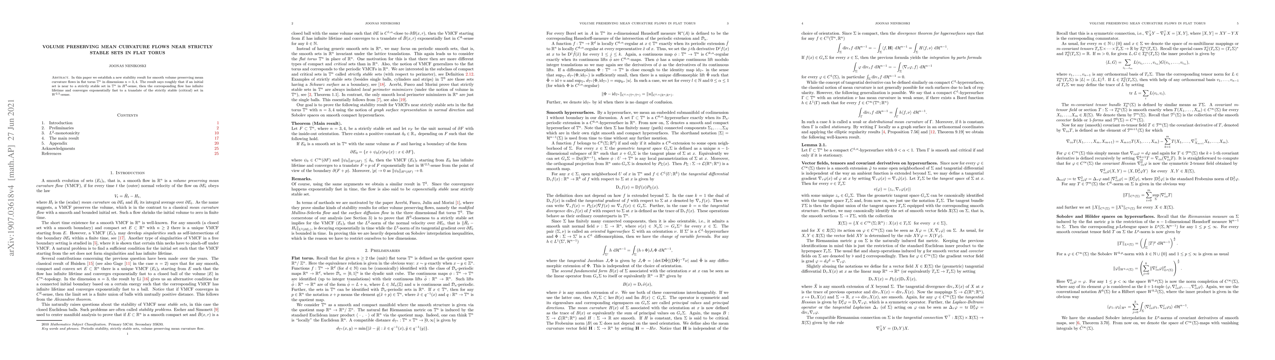 This paper proves a stability result for smooth volume-preserving mean curvature flows in flat torus $\mathbb T^n$ for $n=3,4$, showing that flows starting near strictly stable sets converge exponentially fast to translates of these sets. The study establishes infinite lifetime for such flows.
