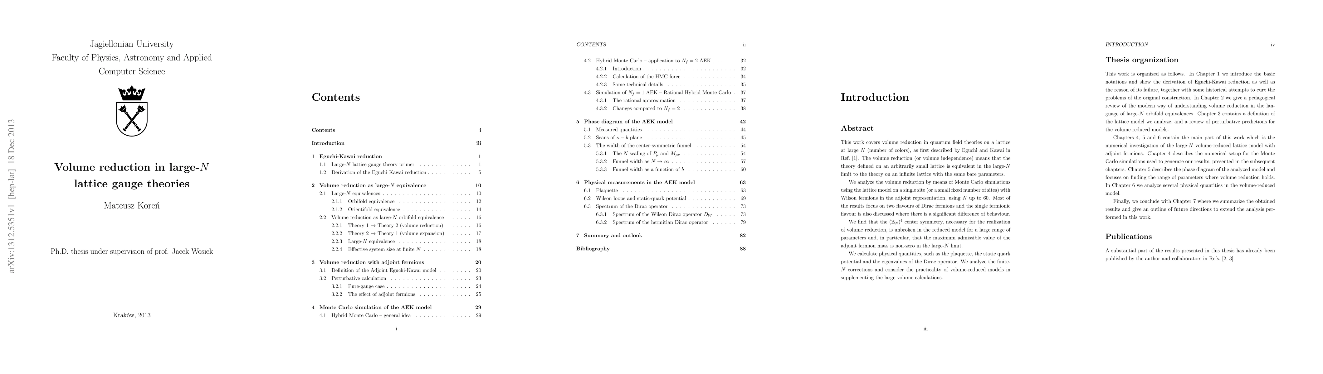 This work covers volume reduction in quantum field theories on a lattice at large $N$ (number of colors), as first described by Eguchi and Kawai in 1982. The volume reduction (or volume independence) means that the theory defined on an arbitrarily small lattice is equivalent in the large-$N$ limit to the theory on an infinite lattice with the same bare parameters. We analyze the volume reduction by means of Monte Carlo simulations using the lattice model on a single site (or a small fixed number of sites) with Wilson fermions in the adjoint representation, using $N$ up to 60. Most of the results focus on two flavours of Dirac fermions and the single fermionic flavour is also discussed where there is a significant difference of behaviour. We find that the $(Z_N)^4$ center symmetry, necessary for the realization of volume reduction, is unbroken in the reduced model for a large range of parameters and, in particular, that the maximum admissible value of the adjoint fermion mass is non-zero in the large-$N$ limit. We calculate physical quantities, such as the plaquette, the static quark potential and the eigenvalues of the Dirac operator. We analyze the finite-$N$ corrections and consider the practicality of volume-reduced models in supplementing the large-volume calculations.