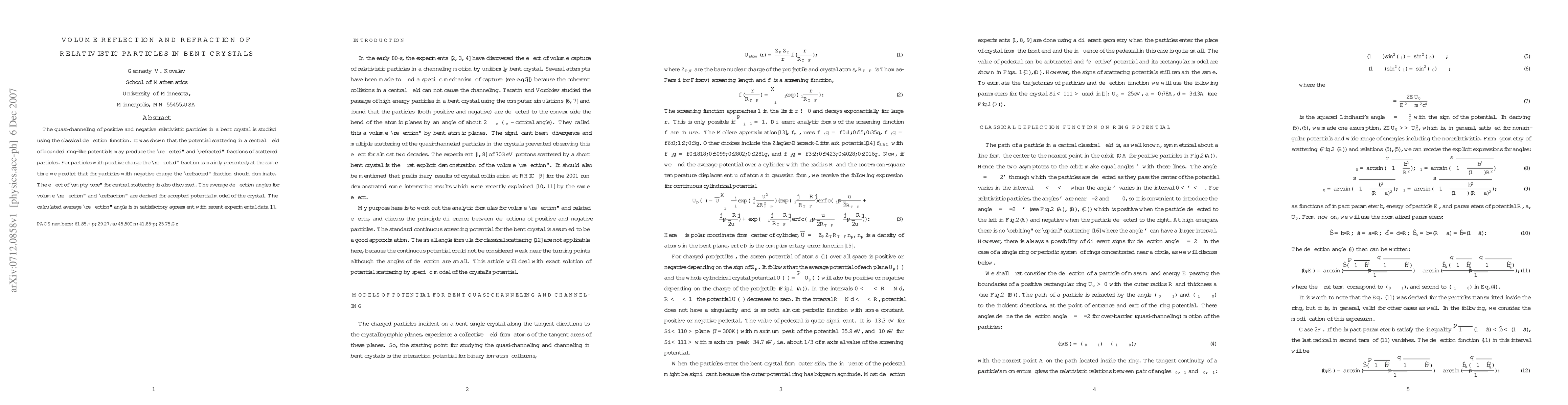 The quasi-channeling of positive and negative relativistic particles in a bent crystal is studied using the classical deflection function. It was shown that the potential scattering in a central field of bounded ring-like potentials may produce the ``reflected'' and ``refracted'' fractions of scattered particles. For particles with positive charge the ``reflected'' fraction is mainly presented; at the same time we predict that for particles with negative charge the ``refracted'' fraction should dominate. The effect of ``empty core'' for central scattering is also discussed. The average deflection angles for volume ``reflection'' and ``refraction'' are derived for accepted potential model of the crystal. The calculated average ``reflection'' angle is in satisfactory agreement with recent experimental data \cite{ivanov_2006}