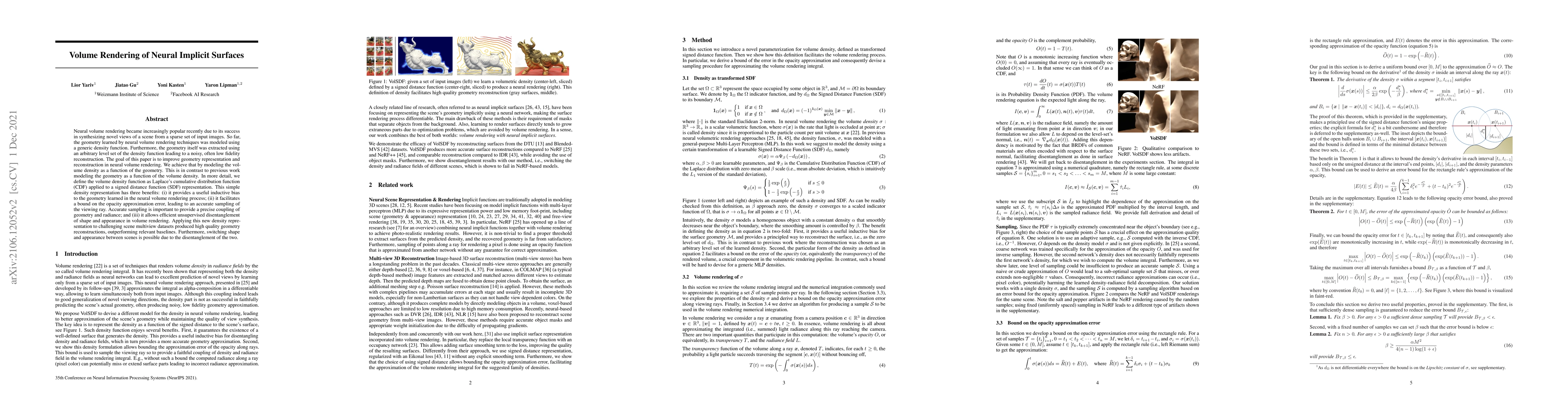 This paper proposes a novel method for neural volume rendering by modeling volume density as a Laplace cumulative distribution function applied to a signed distance function, which enhances geometry representation and reconstruction. This approach provides an inductive bias, improves opacity approximation, and enables efficient unsupervised disentanglement of shape and appearance, leading to high-quality reconstructions and scene switching.