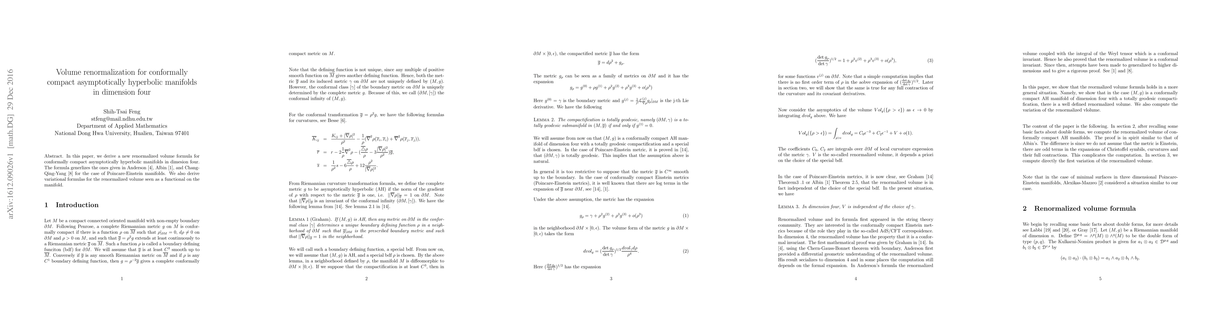 We derive a new renormalized volume formula for conformally compact asymptotically hyperbolic manifolds in dimension four. The formula generalizes the ones given by Anderson, Albin, and Chang-Qing-Yang for the case of Poincare-Einstein manifolds. We also derive variational formulas for the renormalized seen as a functional on the manifold.