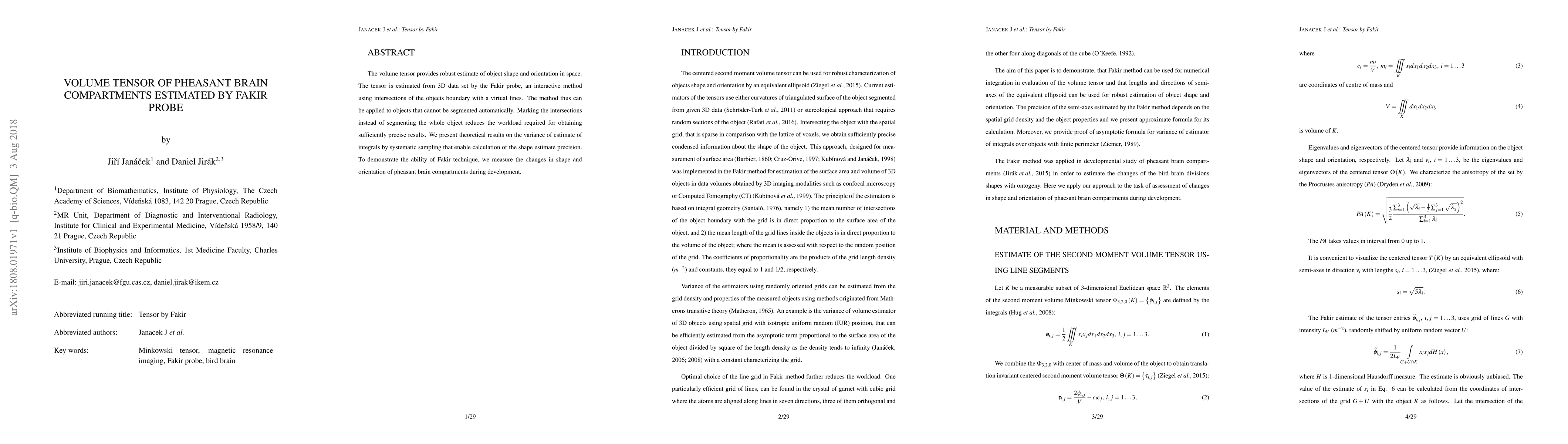 The volume tensor provides robust estimate of object shape and orientation in space. The tensor is estimated from 3D data set by the Fakir probe, an interactive method using intersections of the objects boundary with a virtual lines. The method thus can be applied to objects that cannot be segmented automatically. Marking the intersections instead of segmenting the whole object reduces the workload required for obtaining sufficiently precise results. We present theoretical results on the variance of estimate of integrals by systematic sampling that enable calculation of the shape estimate precision. To demonstrate the ability of Fakir technique, we measure the changes in shape and orientation of pheasant brain compartments during development.
