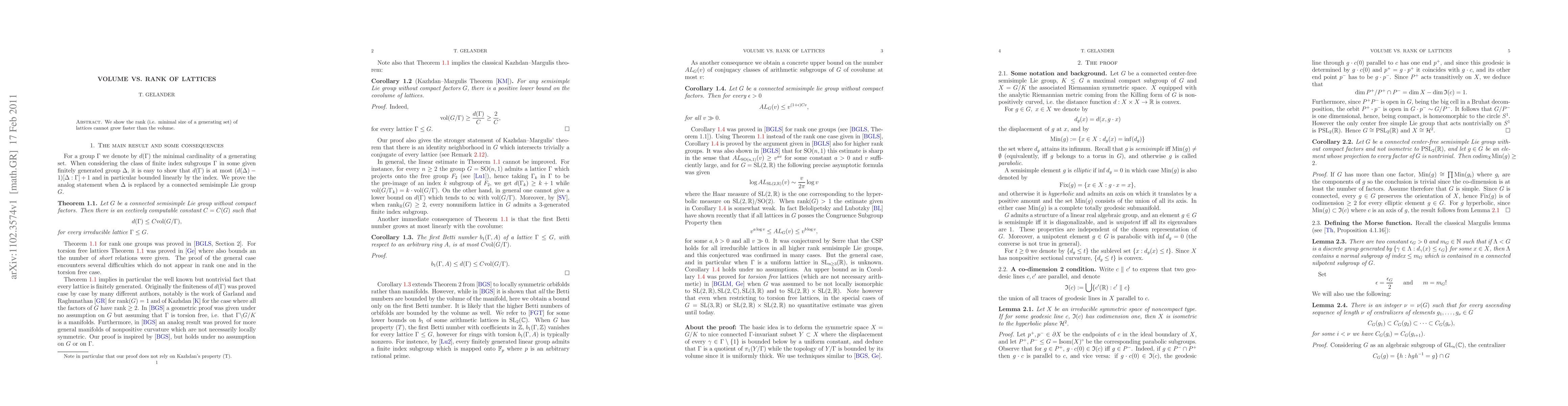 Summary: This paper demonstrates that the rank of lattices, defined as the minimal size of a generating set, cannot increase at a rate faster than the volume of the lattice. This establishes a fundamental relationship between the structural complexity and geometric size of lattices.
