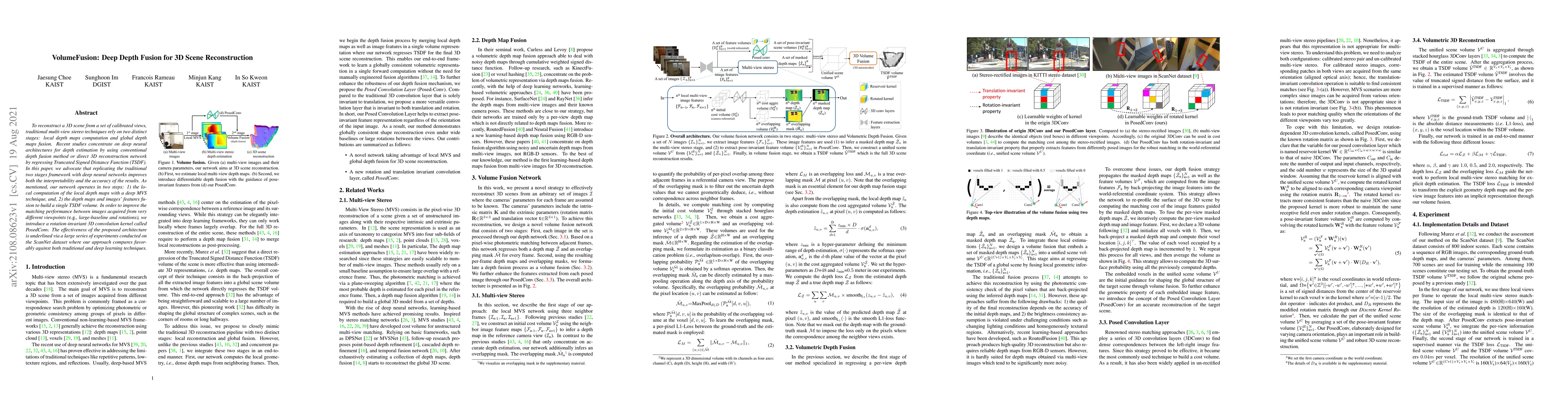 To reconstruct a 3D scene from a set of calibrated views, traditional multi-view stereo techniques rely on two distinct stages: local depth maps computation and global depth maps fusion. Recent studies concentrate on deep neural architectures for depth estimation by using conventional depth fusion method or direct 3D reconstruction network by regressing Truncated Signed Distance Function (TSDF). In this paper, we advocate that replicating the traditional two stages framework with deep neural networks improves both the interpretability and the accuracy of the results. As mentioned, our network operates in two steps: 1) the local computation of the local depth maps with a deep MVS technique, and, 2) the depth maps and images' features fusion to build a single TSDF volume. In order to improve the matching performance between images acquired from very different viewpoints (e.g., large-baseline and rotations), we introduce a rotation-invariant 3D convolution kernel called PosedConv. The effectiveness of the proposed architecture is underlined via a large series of experiments conducted on the ScanNet dataset where our approach compares favorably against both traditional and deep learning techniques.