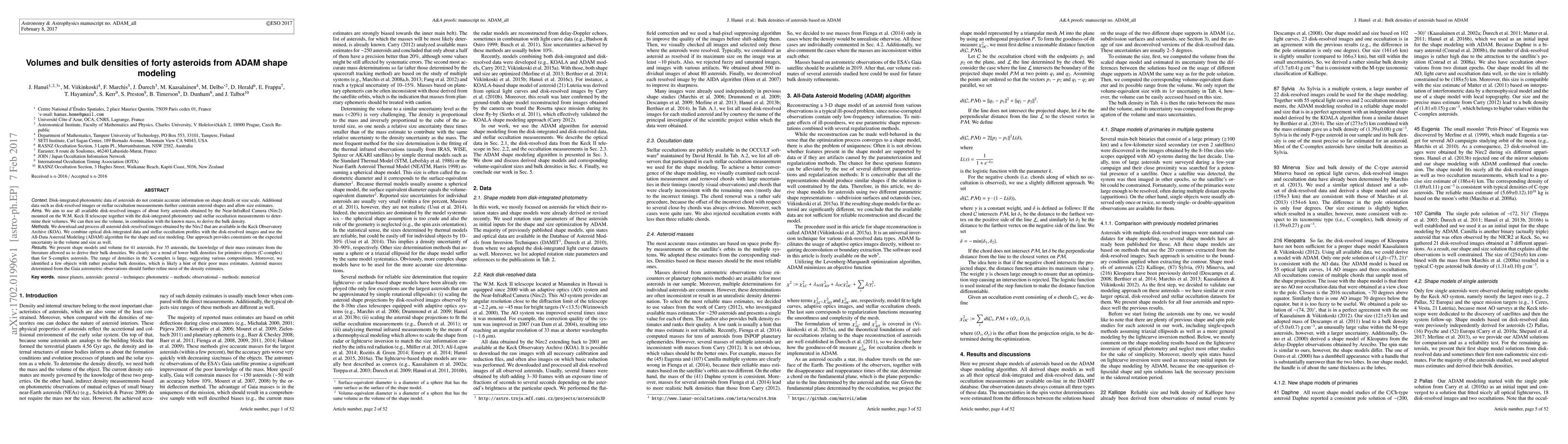Disk-integrated photometric data of asteroids do not contain accurate information on shape details or size scale. Additional data such as disk-resolved images or stellar occultation measurements further constrain asteroid shapes and allow size estimates. We aim to use all available disk-resolved images of about forty asteroids obtained by the Near-InfraRed Camera (Nirc2) mounted on the W.M. Keck II telescope together with the disk-integrated photometry and stellar occultation measurements to determine their volumes. We can then use the volume, in combination with the known mass, to derive the bulk density. We download and process all asteroid disk-resolved images obtained by the Nirc2 that are available in the Keck Observatory Archive (KOA). We combine optical disk-integrated data and stellar occultation profiles with the disk-resolved images and use the All-Data Asteroid Modeling (ADAM) algorithm for the shape and size modeling. Our approach provides constraints on the expected uncertainty in the volume and size as well. We present shape models and volume for 41 asteroids. For 35 asteroids, the knowledge of their mass estimates from the literature allowed us to derive their bulk densities. We clearly see a trend of lower bulk densities for primitive objects (C-complex) than for S-complex asteroids. The range of densities in the X-complex is large, suggesting various compositions. Moreover, we identified a few objects with rather peculiar bulk densities, which is likely a hint of their poor mass estimates. Asteroid masses determined from the Gaia astrometric observations should further refine most of the density estimates.
