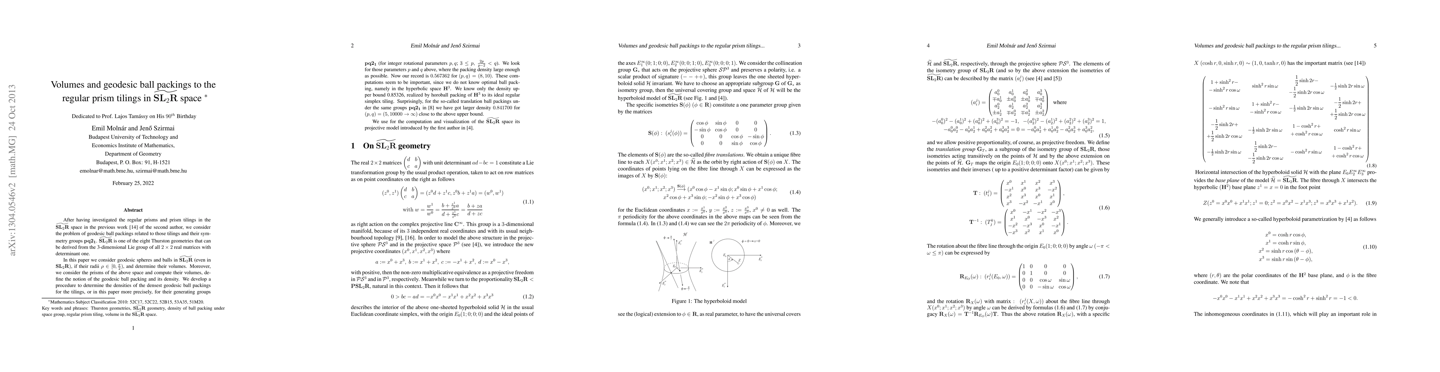 This paper investigates the volumes of geodesic balls and prisms in the $\SLR$ space, determining their packing densities and comparing them to known upper bounds in hyperbolic space. The authors compute the densest packing densities for prism tilings generated by $\mathbf{pq2_1}$ groups, achieving a record density of $0.567362$ for $(p, q) = (8, 10)$.