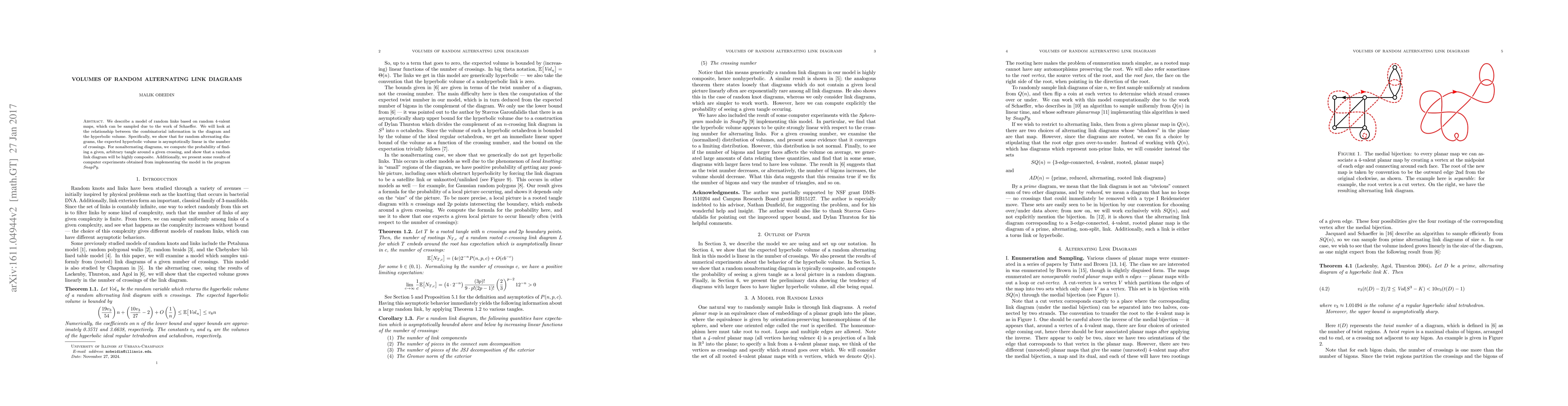 This paper explores random alternating link diagrams derived from random 4-valent maps, demonstrating that their expected hyperbolic volume grows linearly with the number of crossings. For nonalternating diagrams, it finds high compositeness and reports results from computer experiments using the SnapPy program.