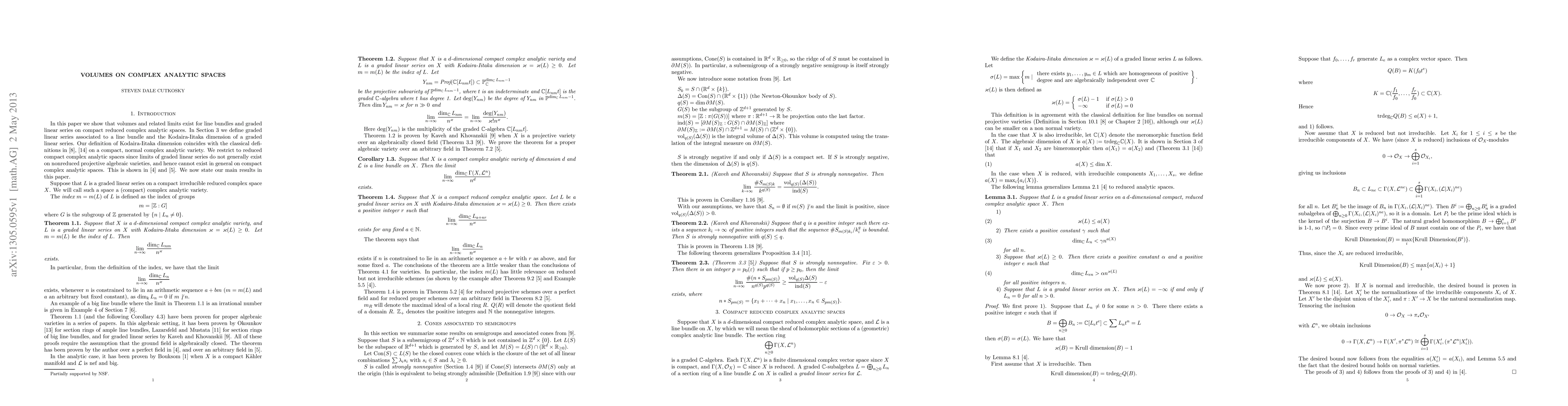 This research paper establishes that volumes exist for line bundles and graded linear series on compact reduced complex analytic spaces, building on the Kodaira-Iitaka dimension concept.
