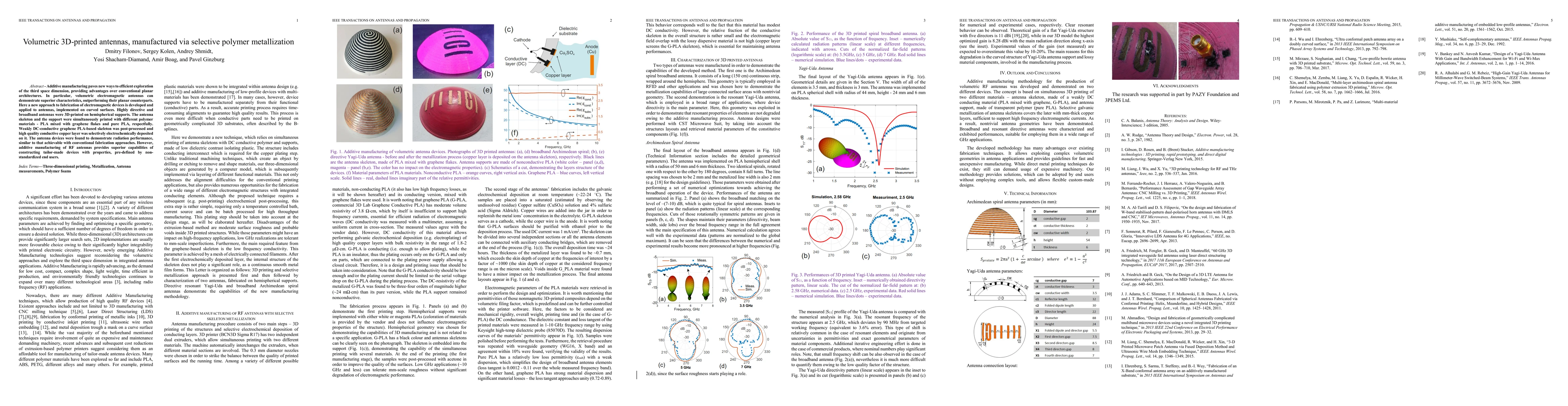 This paper explores the fabrication of volumetric 3D-printed antennas using selective polymer metallization, demonstrating highly directive and broadband performance. The method involves printing antenna skeletons and supports from different polymer materials and depositing a conductive copper layer via electrochemical processing, achieving radiation performance comparable to conventional methods while offering customizable design.