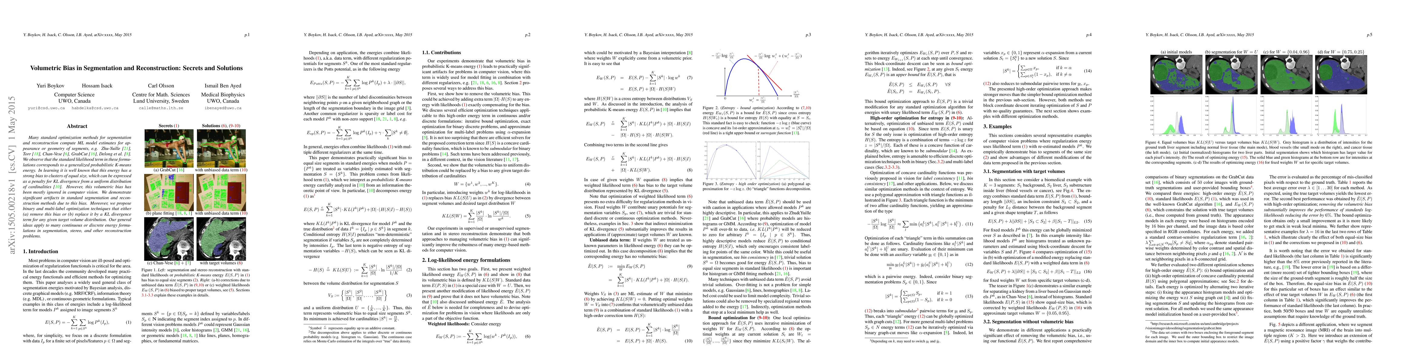 Many standard optimization methods for segmentation and reconstruction compute ML model estimates for appearance or geometry of segments, e.g. Zhu-Yuille 1996, Torr 1998, Chan-Vese 2001, GrabCut 2004, Delong et al. 2012. We observe that the standard likelihood term in these formulations corresponds to a generalized probabilistic K-means energy. In learning it is well known that this energy has a strong bias to clusters of equal size, which can be expressed as a penalty for KL divergence from a uniform distribution of cardinalities. However, this volumetric bias has been mostly ignored in computer vision. We demonstrate significant artifacts in standard segmentation and reconstruction methods due to this bias. Moreover, we propose binary and multi-label optimization techniques that either (a) remove this bias or (b) replace it by a KL divergence term for any given target volume distribution. Our general ideas apply to many continuous or discrete energy formulations in segmentation, stereo, and other reconstruction problems.