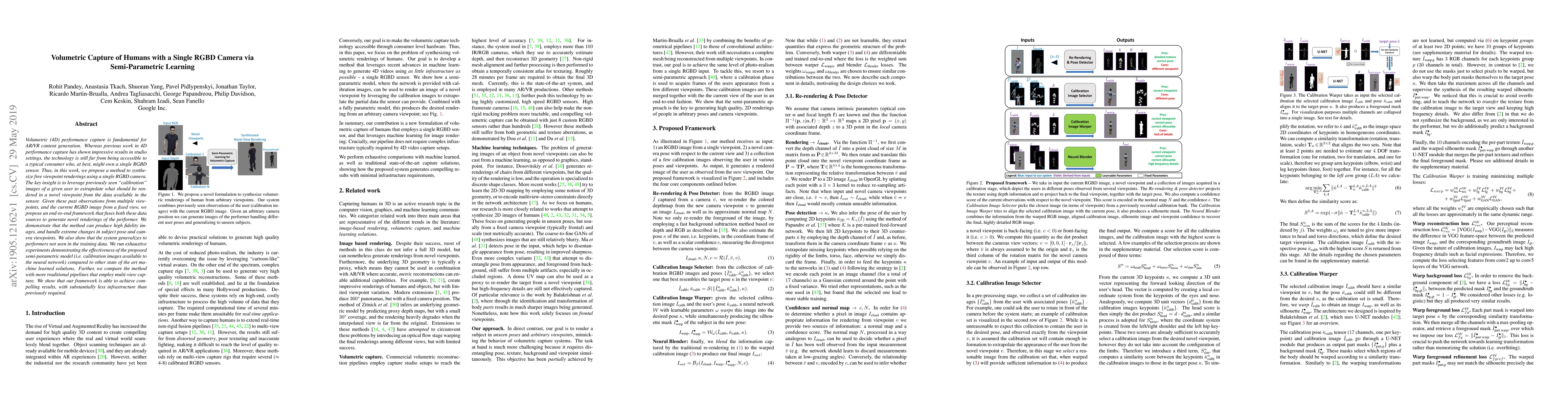 This paper proposes a method for volumetric (4D) performance capture using a single RGBD camera, leveraging semi-parametric learning from calibration images to generate high fidelity free viewpoint renderings. The framework effectively handles extreme pose changes and generalizes to unseen performers, demonstrating superior results compared to traditional multi-view capture methods.