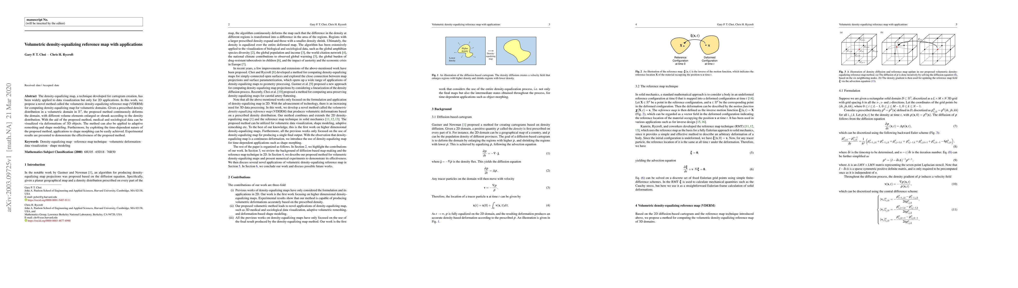 This paper introduces the volumetric density-equalizing reference map (VDERM) for visualizing density distributions in 3D domains by deforming volume elements according to density values. The method enables applications in medical and sociological data visualization, adaptive remeshing, and shape morphing.