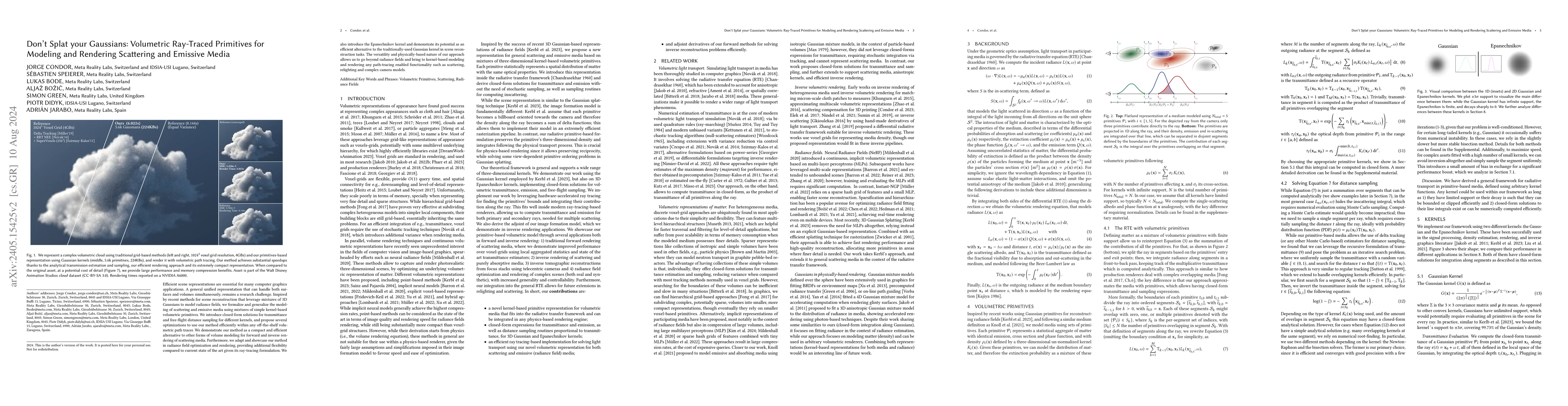 This paper introduces a volumetric primitive-based method for modeling and rendering scattering and emissive media, using mixtures of 3D Gaussian kernels for efficient scene representation and rendering. It provides closed-form solutions for transmittance and free-flight distance sampling and demonstrates its effectiveness compared to voxel grid-based methods.