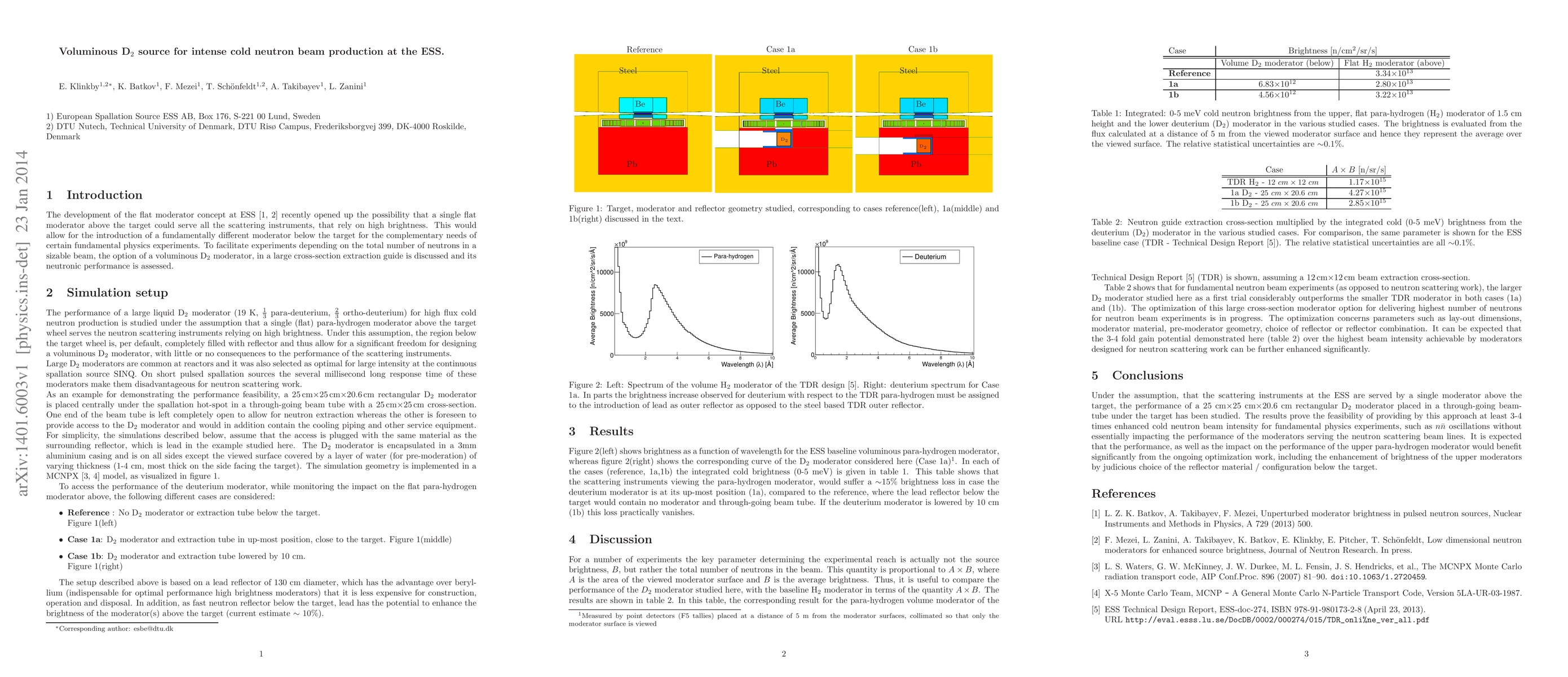 The development of the flat moderator concept at ESS recently opened up the possibility that a single flat moderator above the target could serve all the scattering instruments, that rely on high brightness. This would allow for the introduction of a fundamentally different moderator below the target for the complementary needs of certain fundamental physics experiments. To facilitate experiments depending on the total number of neutrons in a sizable beam, the option of a voluminous D2 moderator, in a large cross-section extraction guide is discussed and its neutronic performance is assessed.