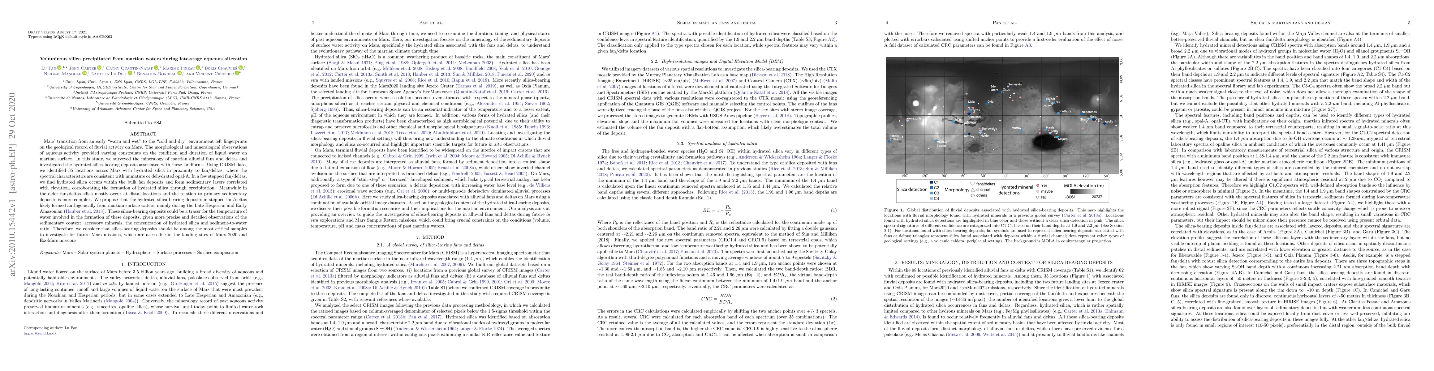 Mars' transition from an early "warm and wet" to the "cold and dry" environment left fingerprints on the geological record of fluvial activity on Mars. The morphological and mineralogical observations of aqueous activity provided varying constraints on the condition and duration of liquid water on martian surface. In this study, we surveyed the mineralogy of martian alluvial fans and deltas and investigated the hydrated silica-bearing deposits associated with these landforms. Using CRISM data, we identified 35 locations across Mars with hydrated silica in proximity to fan/deltas, where the spectral characteristics are consistent with immature or dehydrated opal-A. In a few stepped fan/deltas, we find hydrated silica occurs within the bulk fan deposits and form sedimentary layers correlated with elevation, corroborating the formation of hydrated silica through precipitation. Meanwhile in the older fan/deltas silica mostly occur at distal locations and the relation to primary sedimentary deposits is more complex. We propose that the hydrated silica-bearing deposits in stepped fan/deltas likely formed authigenically from martian surface waters, mainly during the Late Hesperian and Early Amazonian [Hauber et al., 2013]. These silica-bearing deposits could be a tracer for the temperature of water involved in the formation of these deposits, given more precise and detailed observations of the sedimentary context, accessory minerals, the concentration of hydrated silica and sediment-to-water ratio. Therefore, we consider that silica-bearing deposits should be among the most critical samples to investigate for future Mars missions, which are accessible in the landing sites of Mars 2020 and ExoMars missions.