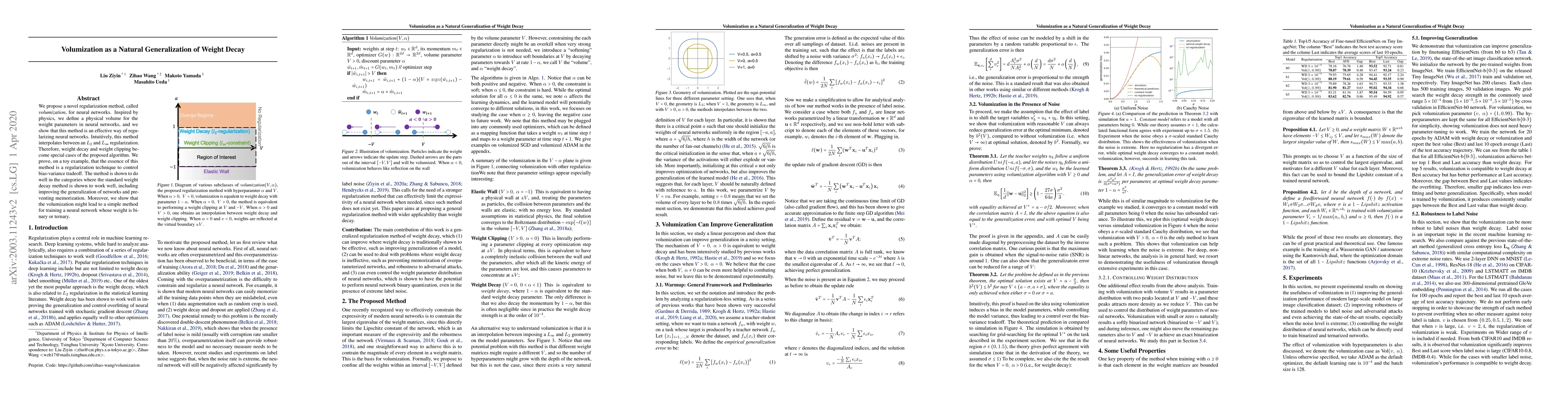 We propose a novel regularization method, called \textit{volumization}, for neural networks. Inspired by physics, we define a physical volume for the weight parameters in neural networks, and we show that this method is an effective way of regularizing neural networks. Intuitively, this method interpolates between an $L_2$ and $L_\infty$ regularization. Therefore, weight decay and weight clipping become special cases of the proposed algorithm. We prove, on a toy example, that the essence of this method is a regularization technique to control bias-variance tradeoff. The method is shown to do well in the categories where the standard weight decay method is shown to work well, including improving the generalization of networks and preventing memorization. Moreover, we show that the volumization might lead to a simple method for training a neural network whose weight is binary or ternary.