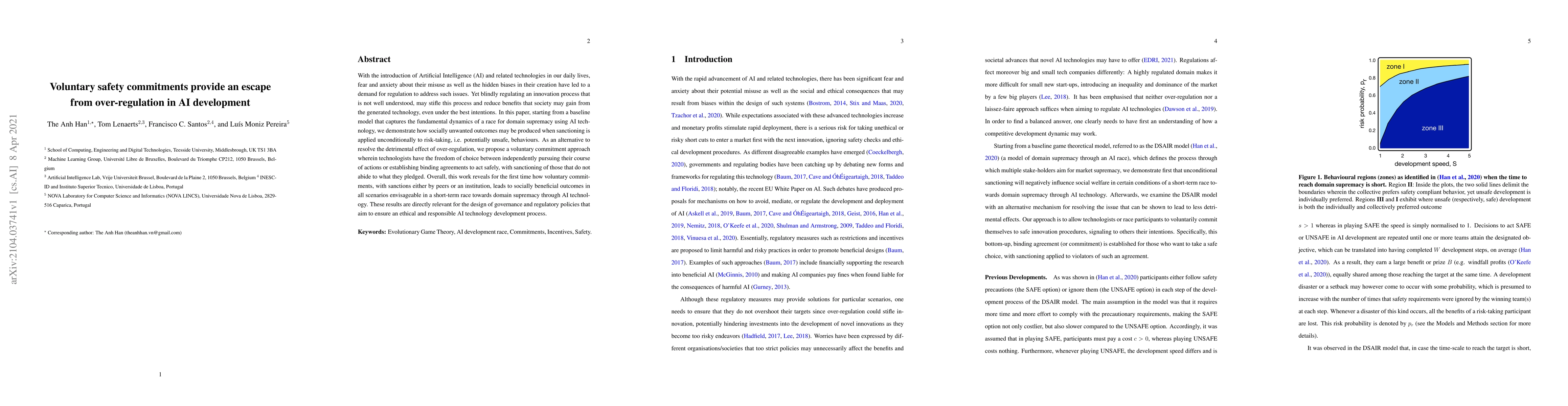With the introduction of Artificial Intelligence (AI) and related technologies in our daily lives, fear and anxiety about their misuse as well as the hidden biases in their creation have led to a demand for regulation to address such issues. Yet blindly regulating an innovation process that is not well understood, may stifle this process and reduce benefits that society may gain from the generated technology, even under the best intentions. In this paper, starting from a baseline model that captures the fundamental dynamics of a race for domain supremacy using AI technology, we demonstrate how socially unwanted outcomes may be produced when sanctioning is applied unconditionally to risk-taking, i.e. potentially unsafe, behaviours. As an alternative to resolve the detrimental effect of over-regulation, we propose a voluntary commitment approach wherein technologists have the freedom of choice between independently pursuing their course of actions or establishing binding agreements to act safely, with sanctioning of those that do not abide to what they pledged. Overall, this work reveals for the first time how voluntary commitments, with sanctions either by peers or an institution, leads to socially beneficial outcomes in all scenarios envisageable in a short-term race towards domain supremacy through AI technology. These results are directly relevant for the design of governance and regulatory policies that aim to ensure an ethical and responsible AI technology development process.