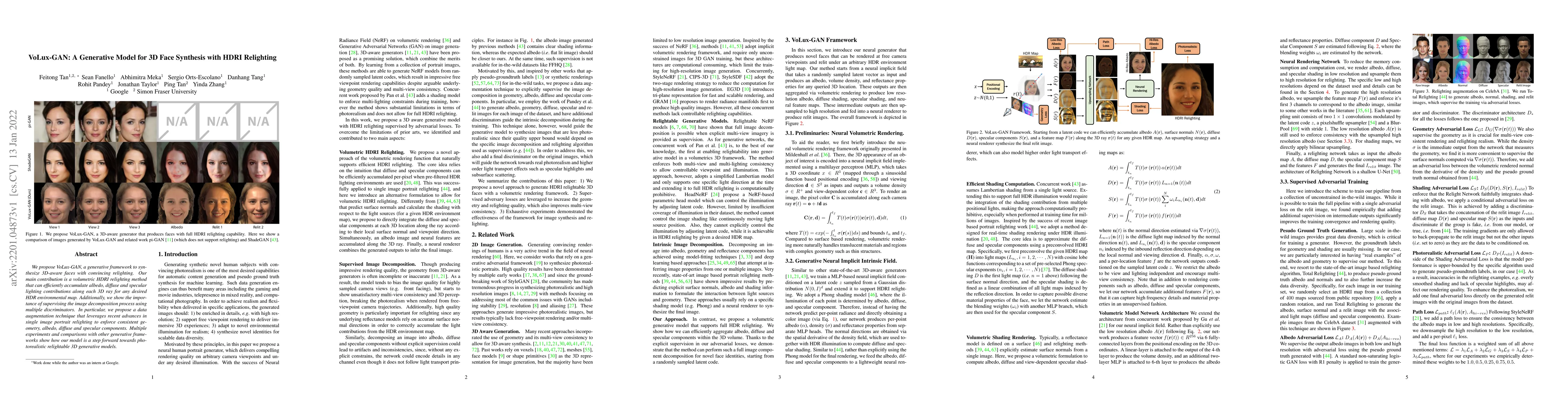 VoLux-GAN introduces a generative framework for synthesizing 3D-aware faces with realistic relighting using volumetric HDRI methods. The model employs multiple discriminators and data augmentation techniques to enhance the consistency of geometry and lighting components, outperforming other generative models in photorealism.