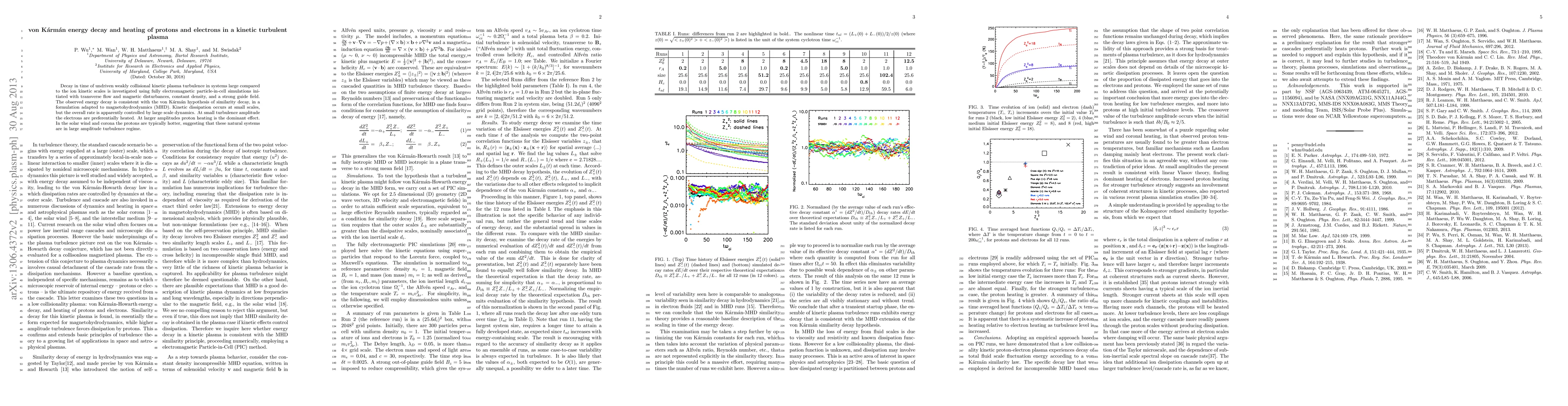 Decay in time of undriven weakly collisional kinetic plasma turbulence in systems large compared to the ion kinetic scales is investigated using fully electromagnetic particle-in-cell simulations initiated with transverse flow and magnetic disturbances, constant density, and a strong guide field. The observed energy decay is consistent with the von K\'arm\'an hypothesis of similarity decay, in a formulation adapted to magnetohydrodyamics (MHD). Kinetic dissipation occurs at small scales, but the overall rate is apparently controlled by large scale dynamics. At small turbulence amplitude the electrons are preferentially heated. At larger amplitudes proton heating is the dominant effect. In the solar wind and corona the protons are typically hotter, suggesting that these natural systems are in large amplitude turbulence regime.