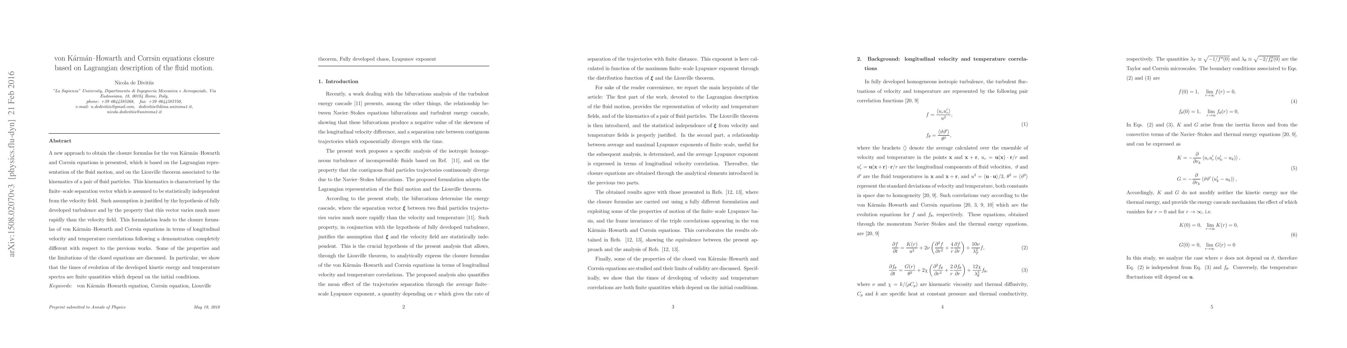 A new approach to obtain the closure formulas for the von K\'arm\'an--Howarth and Corrsin equations is presented, which is based on the Lagrangian representation of the fluid motion, and on the Liouville theorem associated to the kinematics of a pair of fluid particles. This kinematics, characterized by the finite--scale separation vector, is assumed to be statistically independent from the velocity field. Such assumption is justified by the hypothesis of fully developed turbulence and by the property that this vector varies much more rapidly than the velocity field. This formulation leads to the closure formulas of von K\'arm\'an--Howarth and Corrsin equations in terms of longitudinal velocity and temperature correlations following a demonstration completely different with respect to the previous works. Some of the properties and the limitations of the closed equations are discussed. In particular, the times of evolution of the developed kinetic energy and temperature spectra are shown to be finite quantities which depend on the initial conditions.
