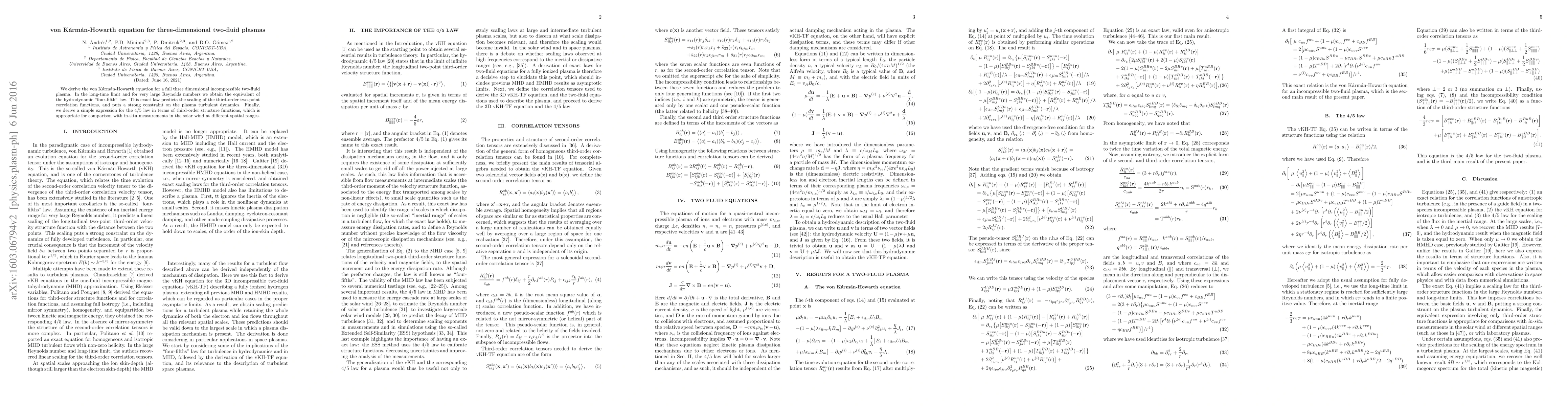 The paper derives the von Kármán-Howarth equation for three-dimensional incompressible two-fluid plasmas, establishing a "four-fifth" law that predicts the scaling of third-order correlation functions and constrains plasma turbulent dynamics. It also provides a simplified expression for this law in terms of third-order structure functions for comparison with solar wind measurements.