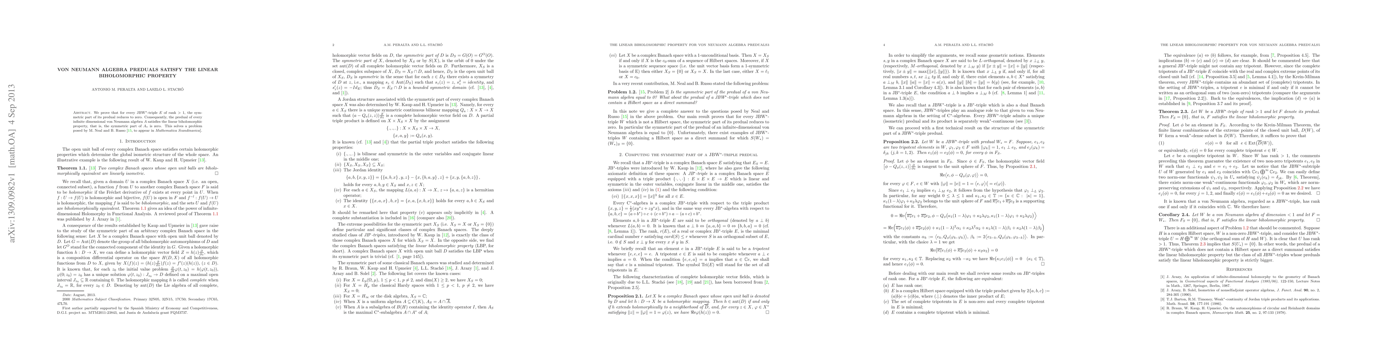 Summary: The paper proves that the predual of every infinite-dimensional von Neumann algebra satisfies the linear biholomorphic property, as the symmetric part of its predual is zero, thereby solving a problem posed by M. Neal and B. Russo.