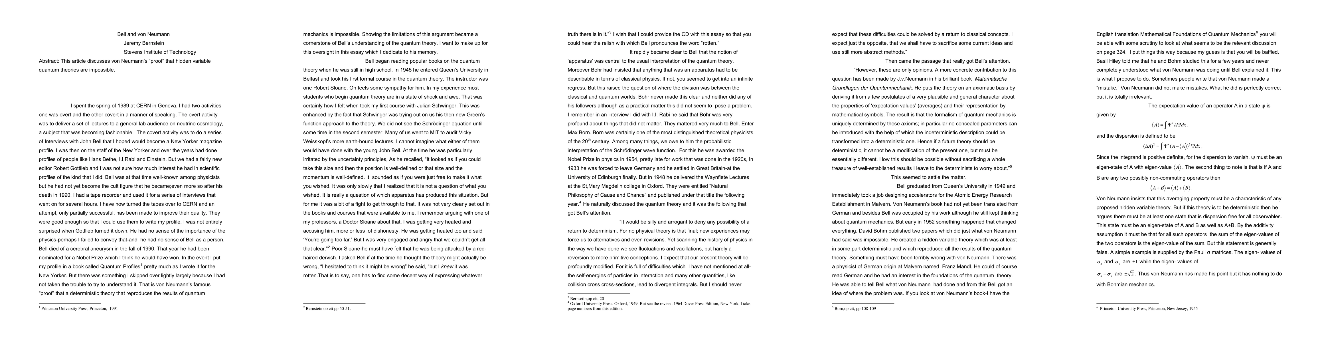 This article discusses von Neumann's "proof" that hidden variable theories are impossible.
