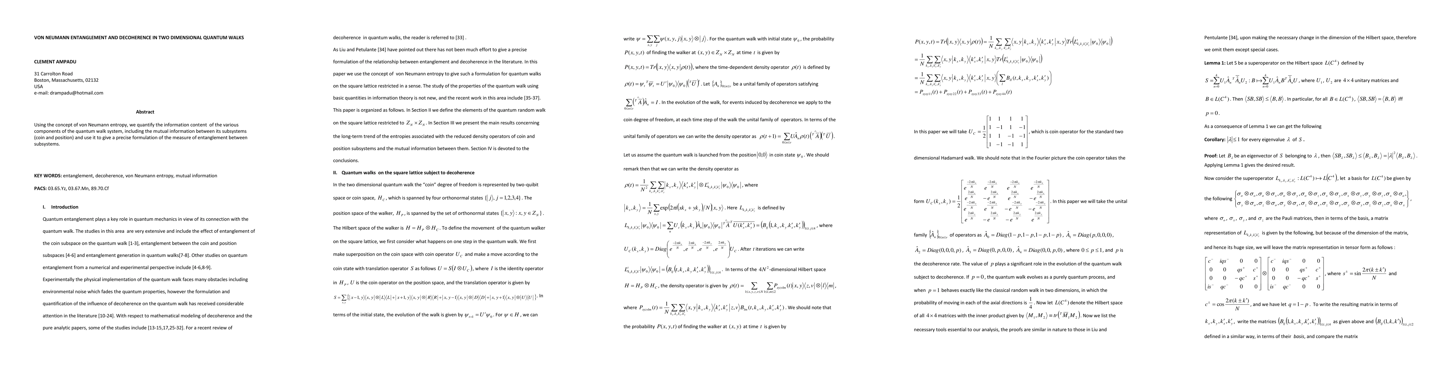 Using the concept of von Neumann entropy, we quantify the information content of the various components of the quantum walk system, including the mutual information between its subsystems (coin and position) and use it to give a precise formulation of the measure of entanglement between subsystems.