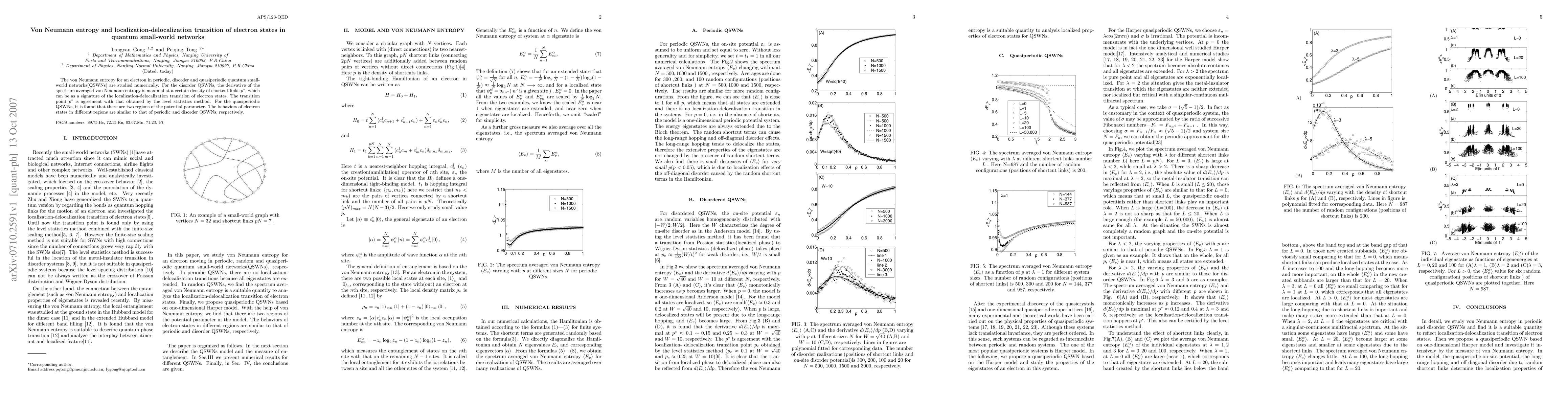 This paper numerically investigates the von Neumann entropy in quantum small-world networks, identifying a localization-delocalization transition at a critical density of shortcut links p*. The transition point p* aligns with results from level statistics, and quasiperiodic networks exhibit behaviors similar to periodic and disordered networks depending on their potential parameters.