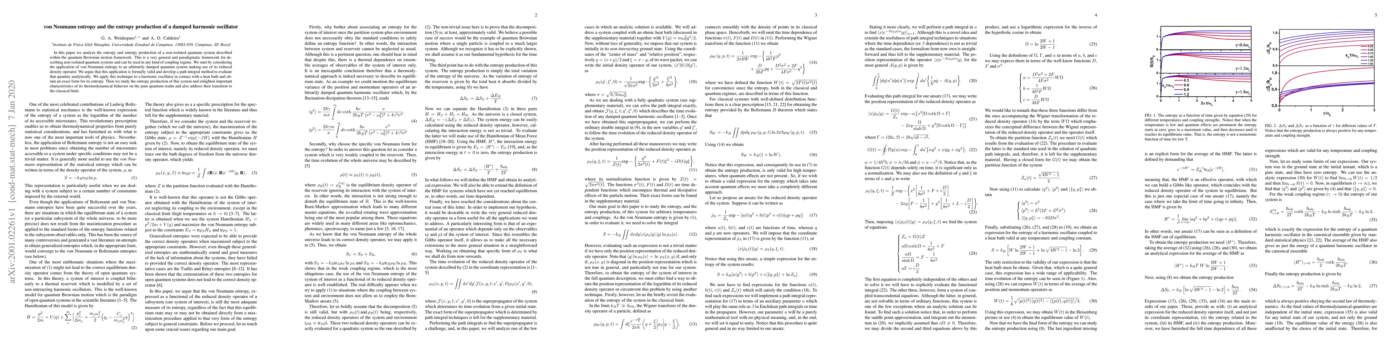 This paper analyzes the von Neumann entropy and entropy production of a damped quantum harmonic oscillator using the quantum Brownian motion framework, deriving an exact form for the oscillator's entropy and exploring its thermodynamic behavior in both quantum and classical limits.