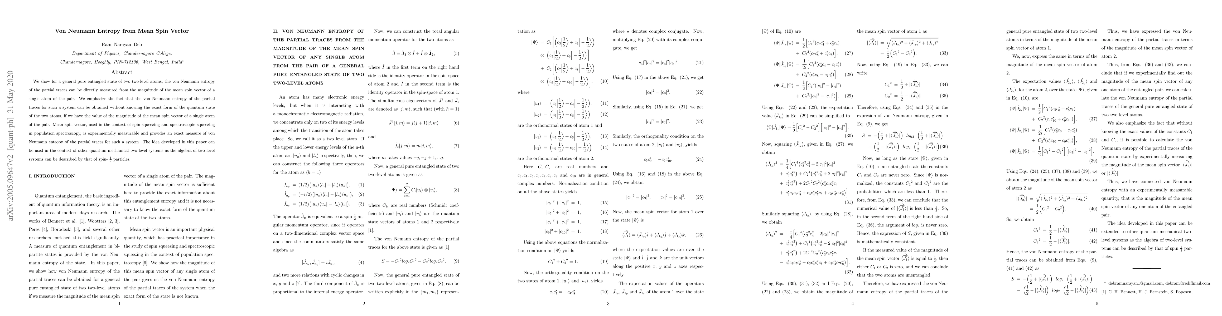 The research demonstrates that the von Neumann entropy of the partial traces for a general pure entangled state of two two-level atoms can be directly measured from the magnitude of the mean spin vector of a single atom in the pair, without needing to know the exact quantum state.
