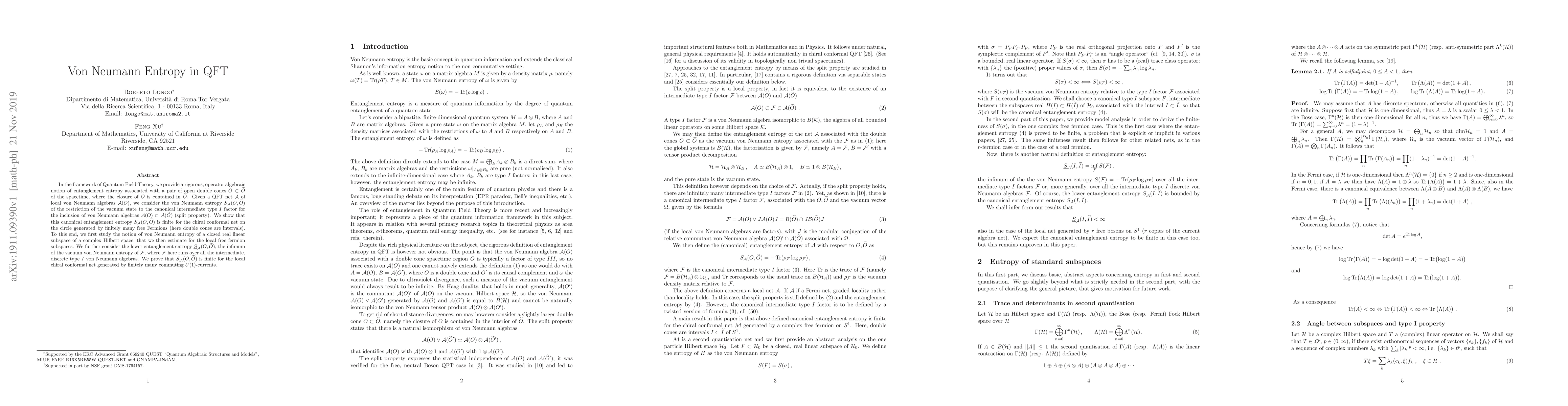 In the framework of Quantum Field Theory, we provide a rigorous, operator algebraic notion of entanglement entropy associated with a pair of open double cones $O \subset \tilde O$ of the spacetime, where the closure of $O$ is contained in $\tilde O$. Given a QFT net $A$ of local von Neumann algebras $A(O)$, we consider the von Neumann entropy $S_A(O, \tilde O)$ of the restriction of the vacuum state to the canonical intermediate type $I$ factor for the inclusion of von Neumann algebras $A(O)\subset A(\tilde O)$ (split property). We show that this canonical entanglement entropy $S_A(O, \tilde O)$ is finite for the chiral conformal net on the circle generated by finitely many free Fermions (here double cones are intervals). To this end, we first study the notion of von Neumann entropy of a closed real linear subspace of a complex Hilbert space, that we then estimate for the local free fermion subspaces. We further consider the lower entanglement entropy $\underline S_A(O, \tilde O)$, the infimum of the vacuum von Neumann entropy of $F$, where $F$ here runs over all the intermediate, discrete type $I$ von Neumann algebras. We prove that $\underline S_A(O, \tilde O)$ is finite for the local chiral conformal net generated by finitely many commuting $U(1)$-currents.